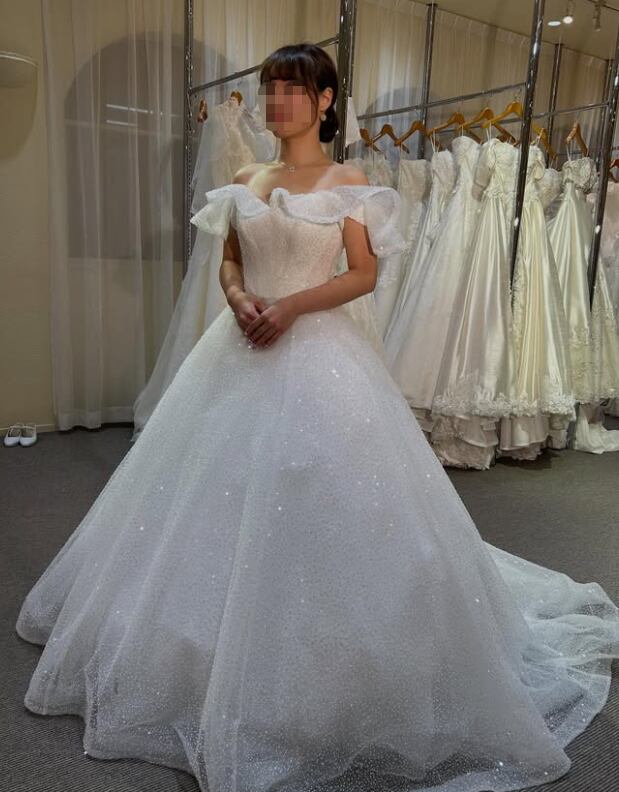 ウエディングドレス オフホワイト オフショルダー 韓国風ドレス シークインチュール 華やかなトレーン 憧れのドレス 結婚式