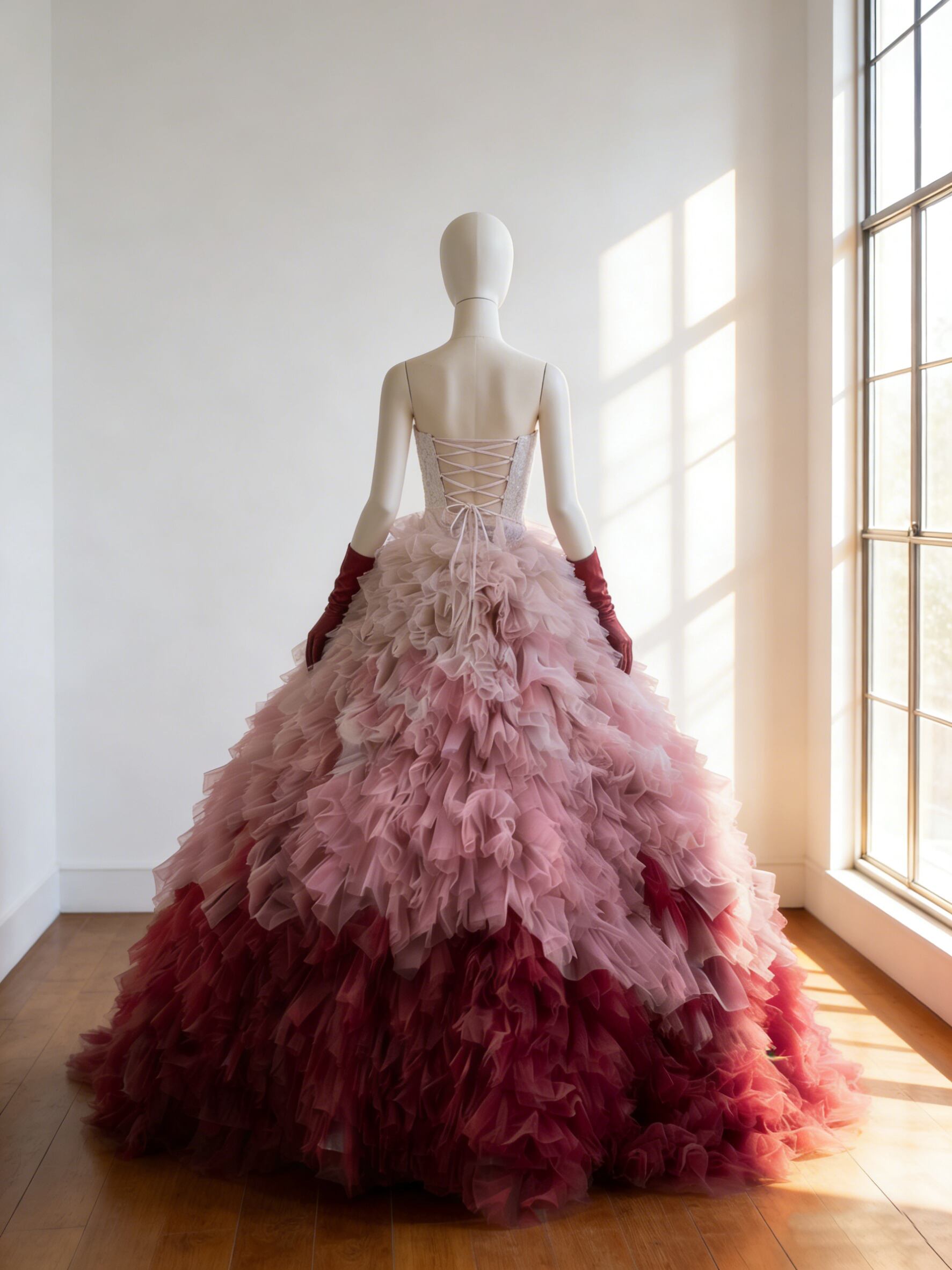 カラードレス ピンク+ボルドー色 もこもこドレス 編み上げ グローブ ビスチェドレス 可愛い花嫁