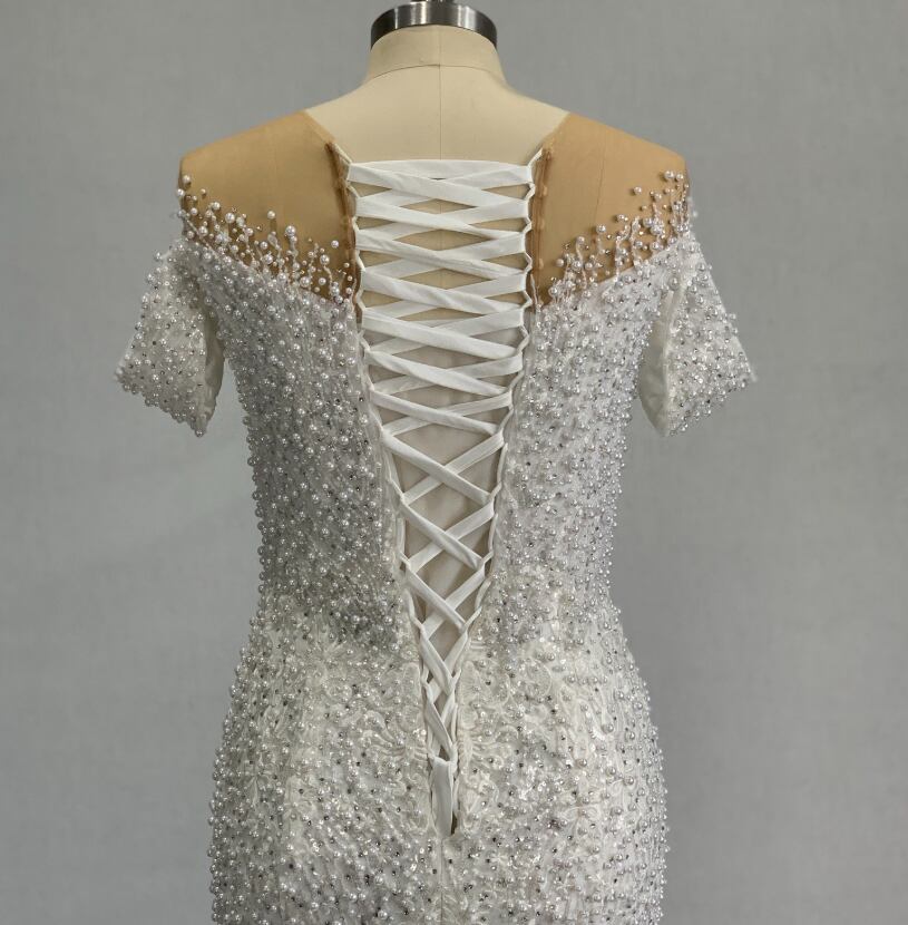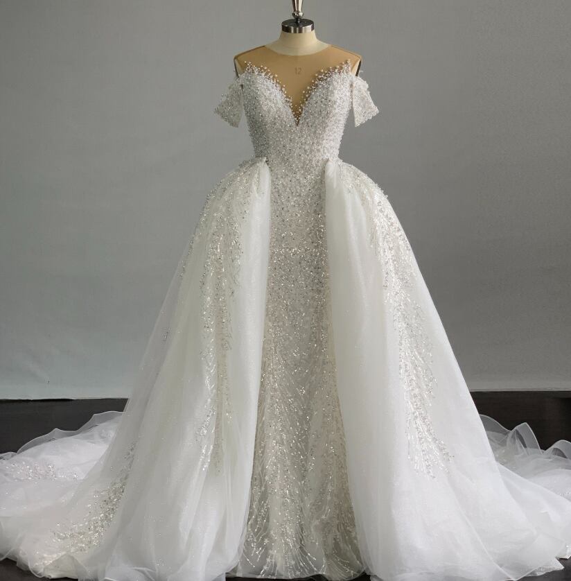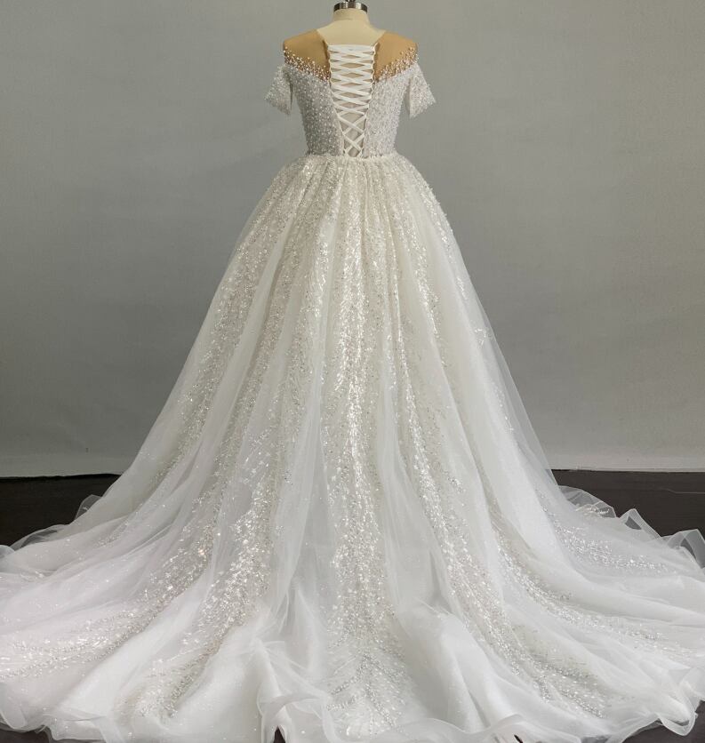 ウエディングドレス オフホワイト オフショルダー 韓国風ドレス キラキラのハンドビーディング 取り外し可能なロングトレーン 編み上げ ブライダル