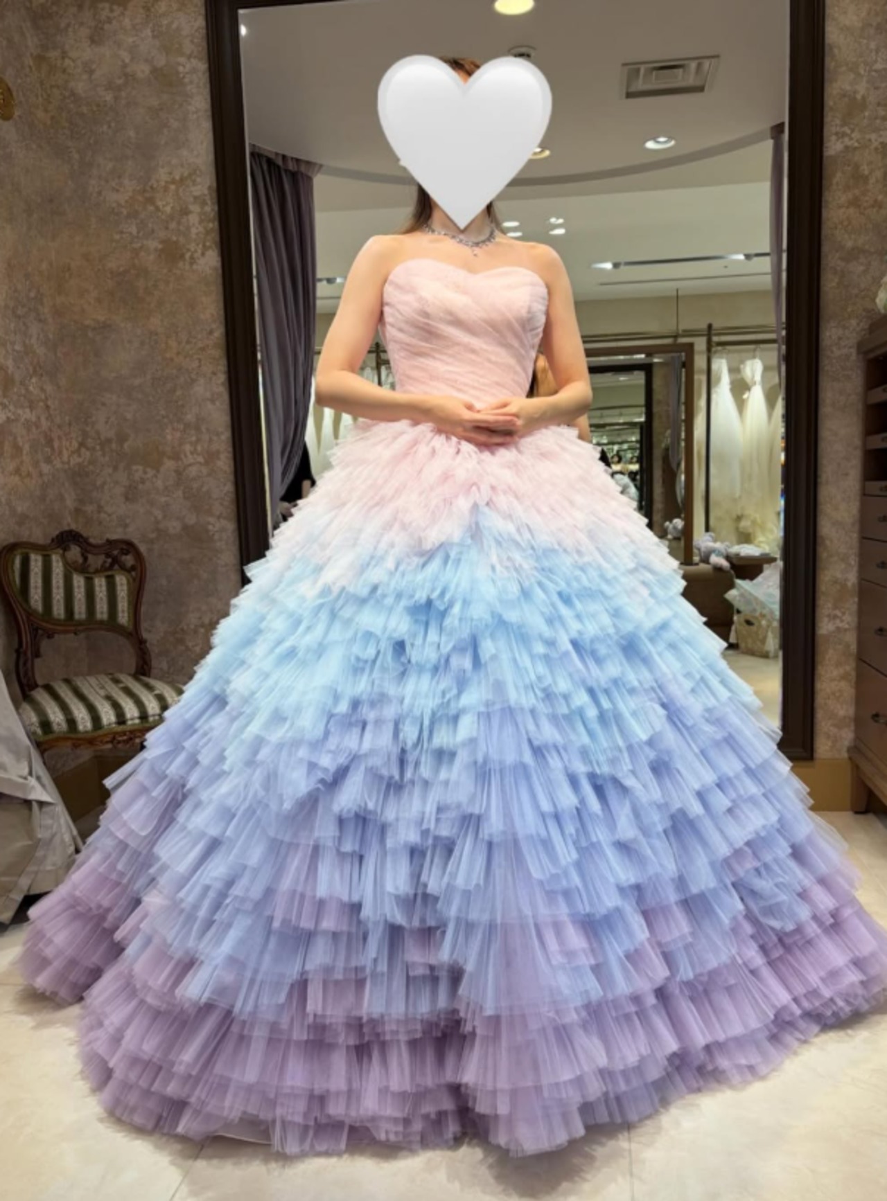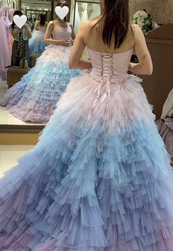 カラードレス グラデーションドレス 編み上げ 柔らかく重ねたチュールスカート 華やかなトレーン ビスチェドレス 花嫁