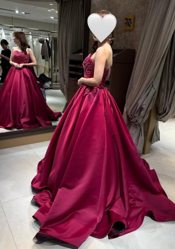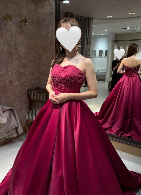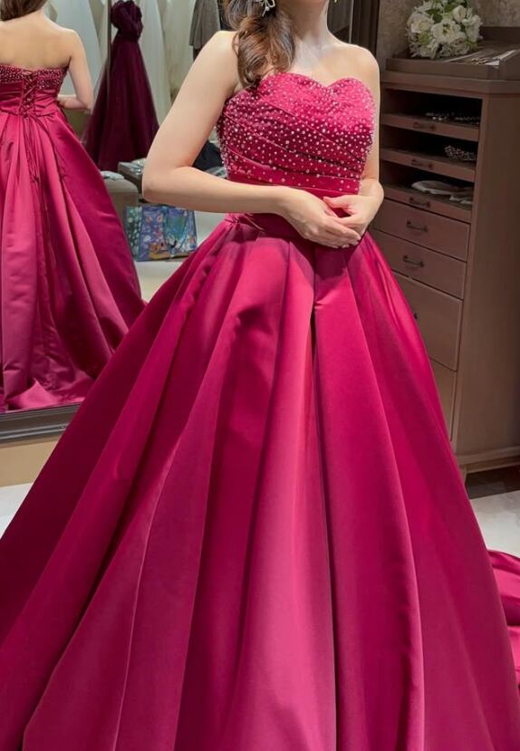 カラードレス ローズマダー パール 光沢サテン 編み上げ 華やかなトレーン ビスチェドレス 結婚式