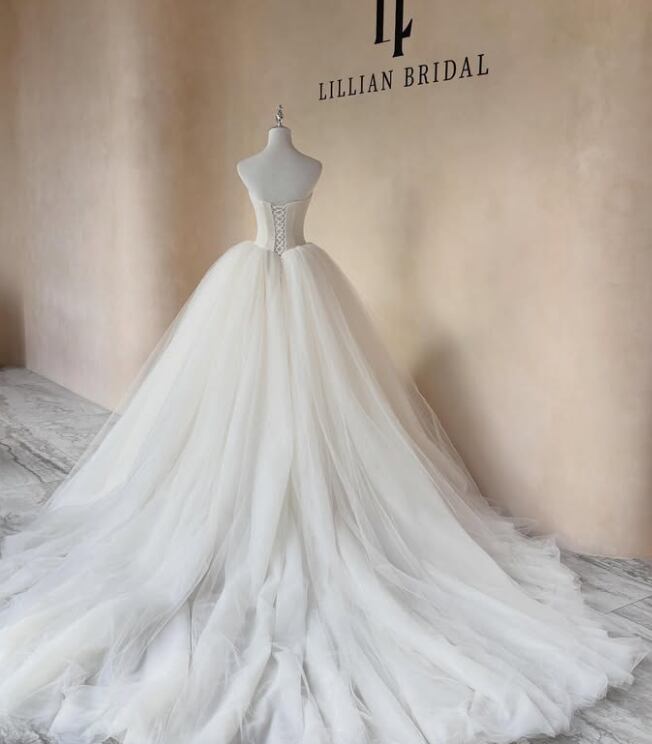 ウエディングドレス オフホワイト ソフトチュール 編み上げ 華やかなトレーン ビスチェドレス 結婚式