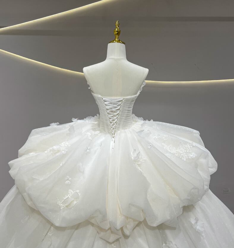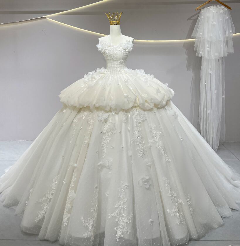 ウエディングドレス オフホワイト 韓国風ドレス 花モチーフ 編み上げ レイヤードドレス 華やかなトレーン ビスチェドレス 結婚式