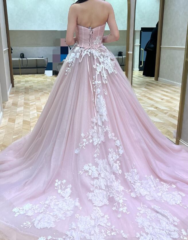 カラードレス ピンク 花柄モチーフで刺繍が美しい シークインチュール 編み上げ 華やかなトレーン ビスチェドレス 花嫁