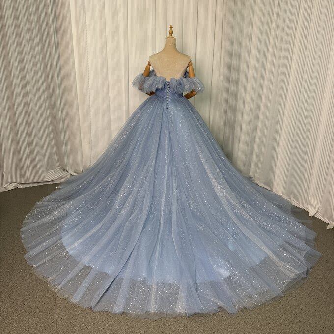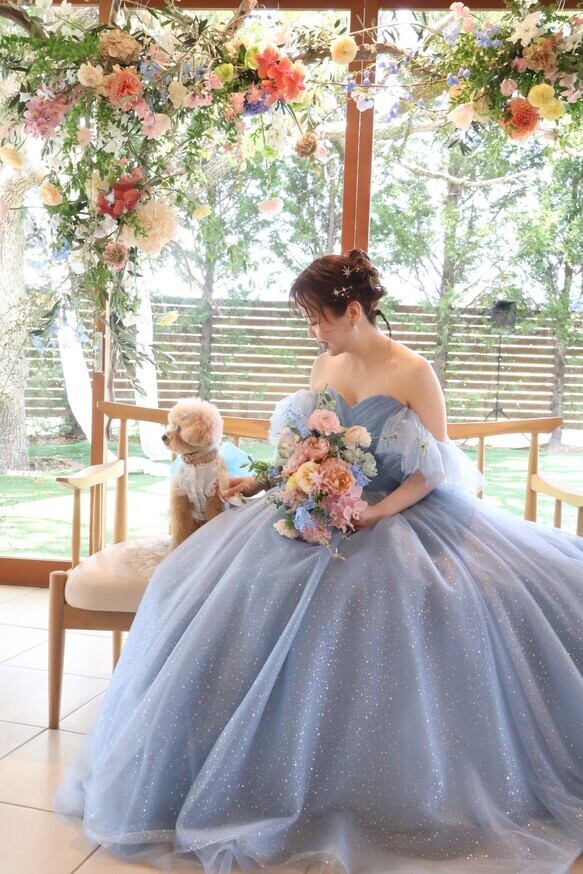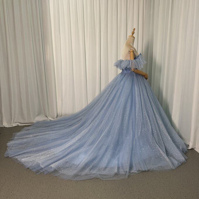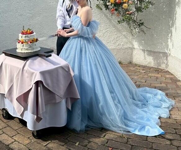 実例写真!カラードレス 爽やかで優しいブルー サッシュベルト シークインチュール オフショルダー 華やかなトレーン 花嫁 前撮り