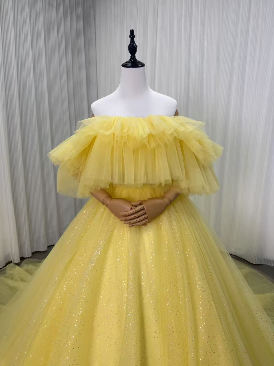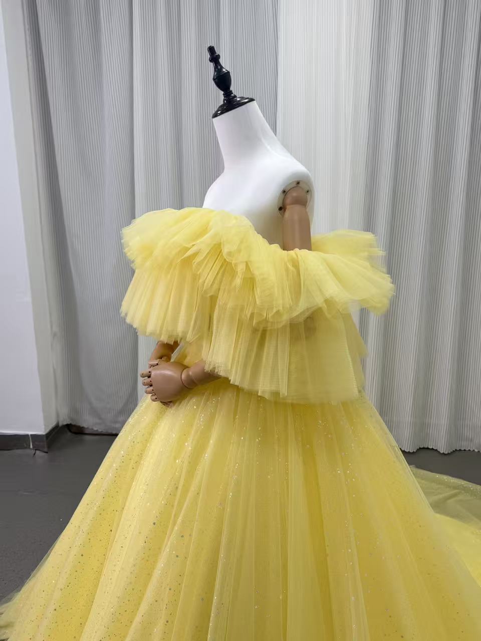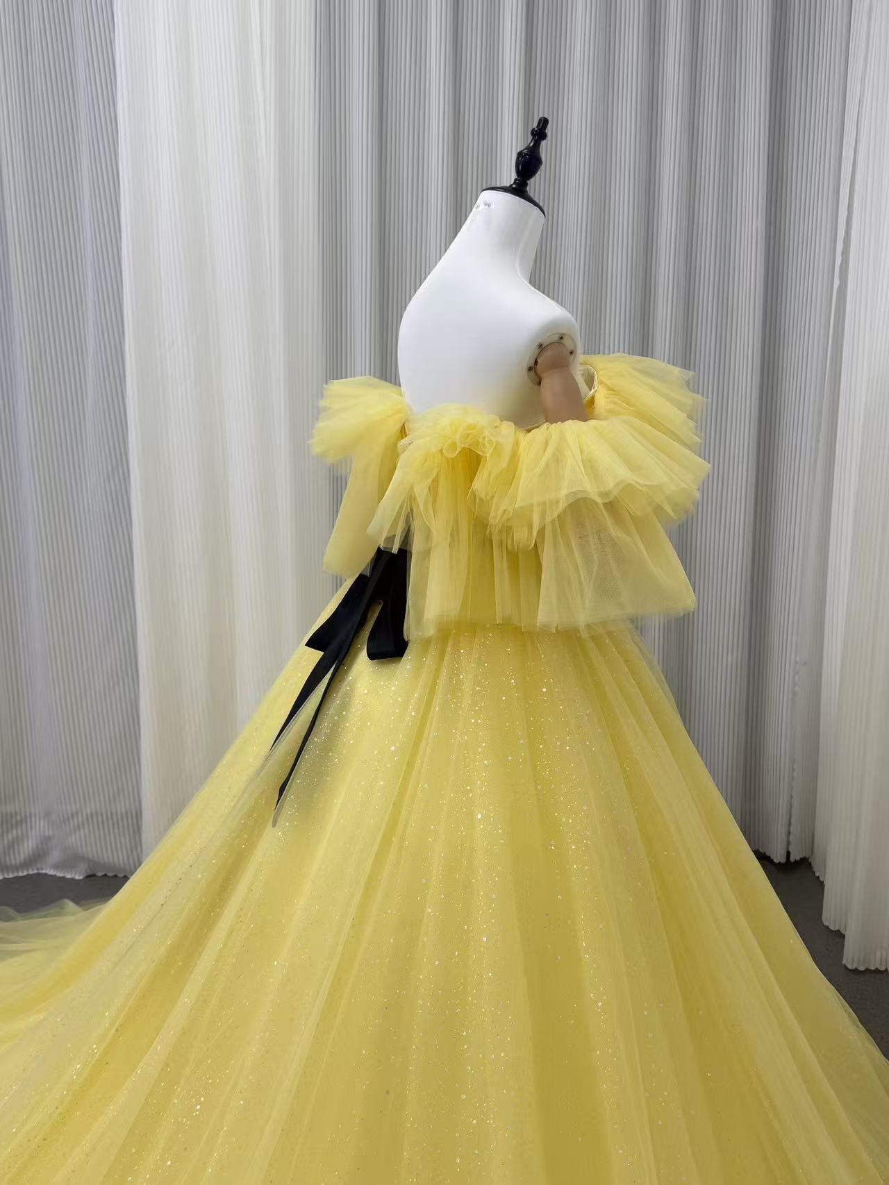 カラードレス 黄色い サッシュベルト シークインチュール オフショルダー 華やかなトレーン 花嫁 前撮り