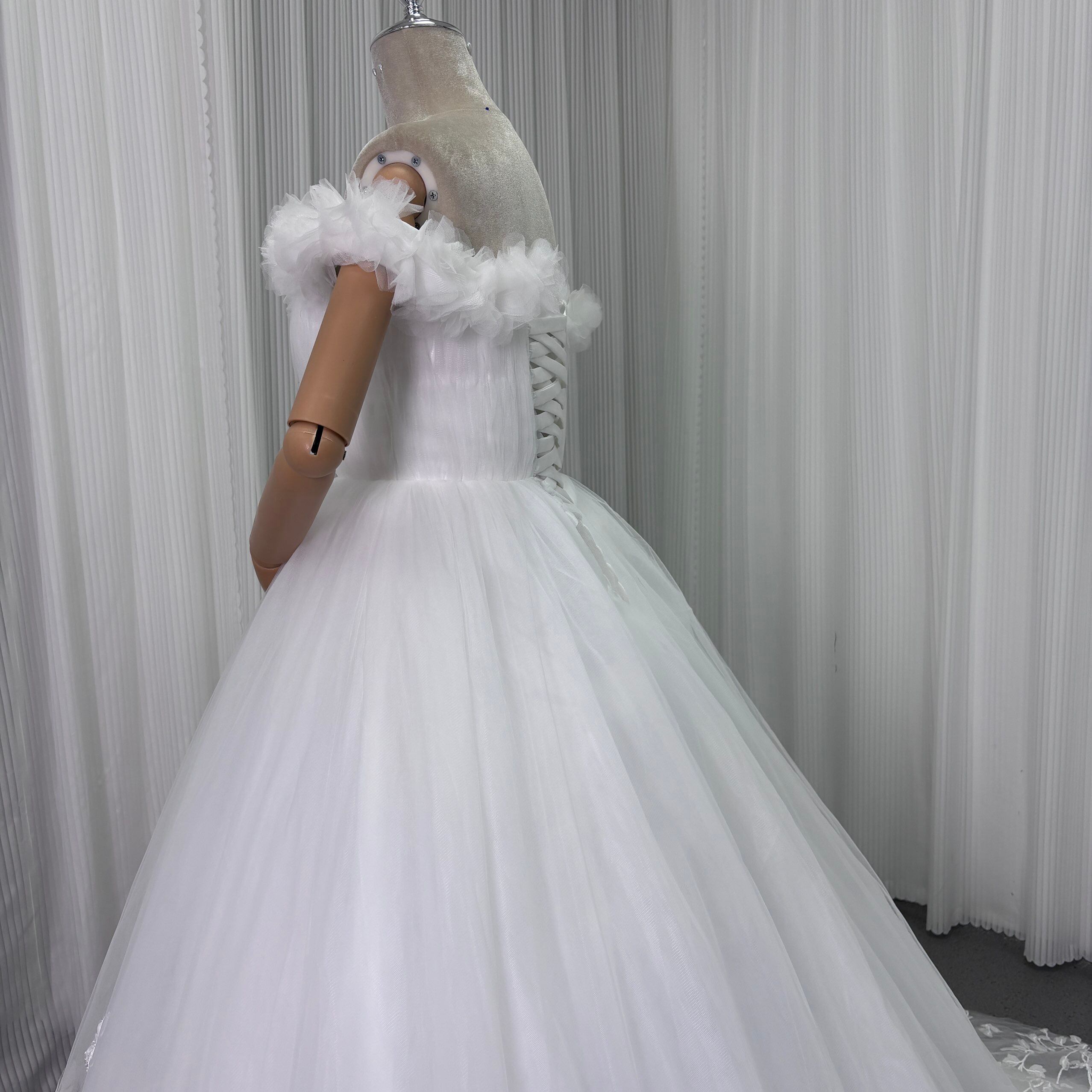 ウエディングドレス オフホワイト オフショルダー リーフ刺繍 編み上げ 華やかなトレーン ブライダル