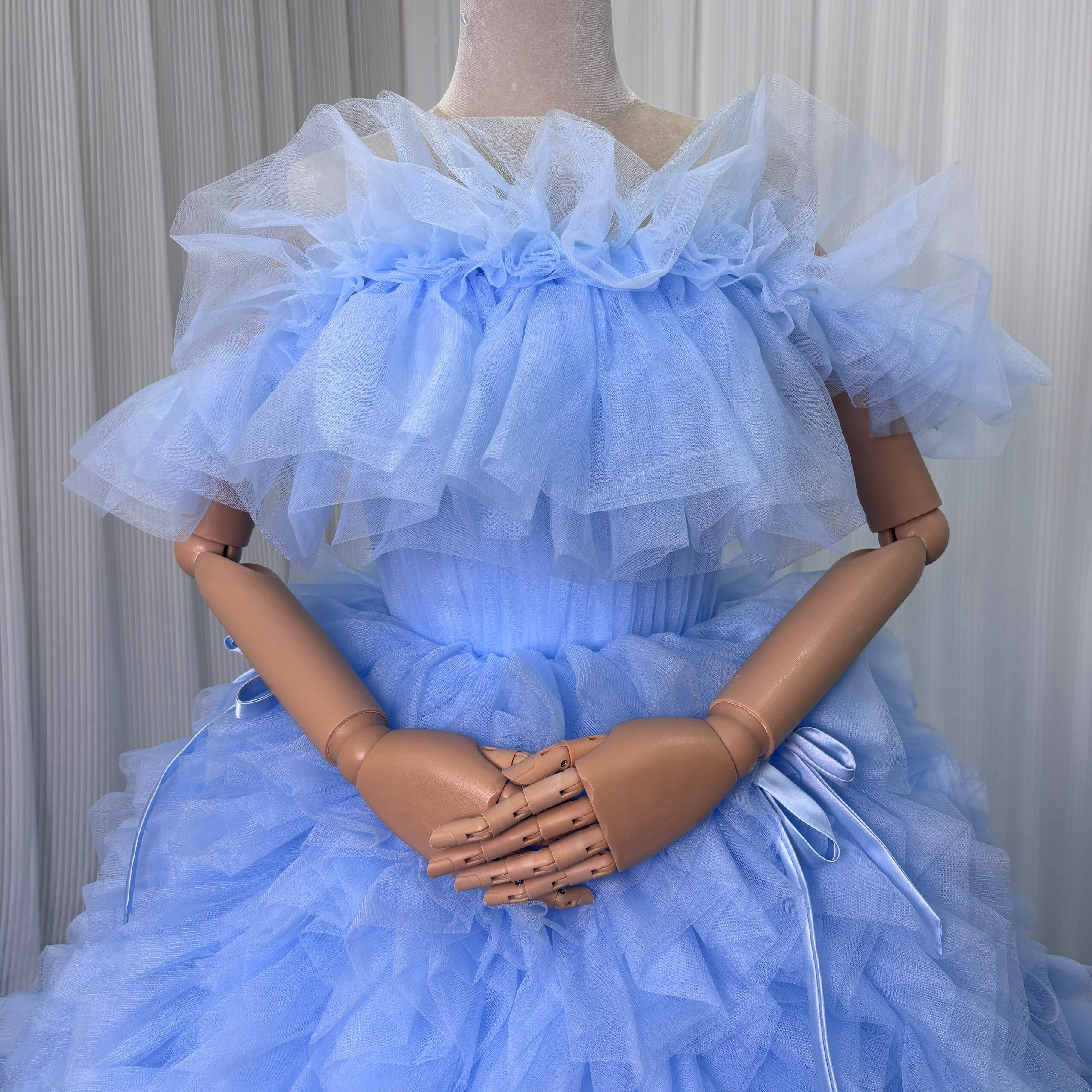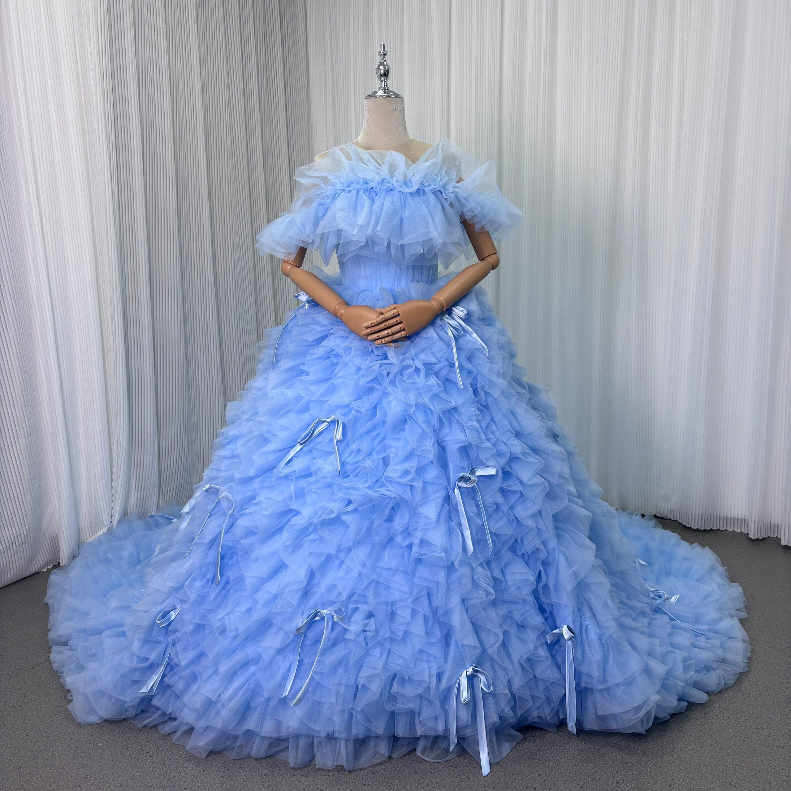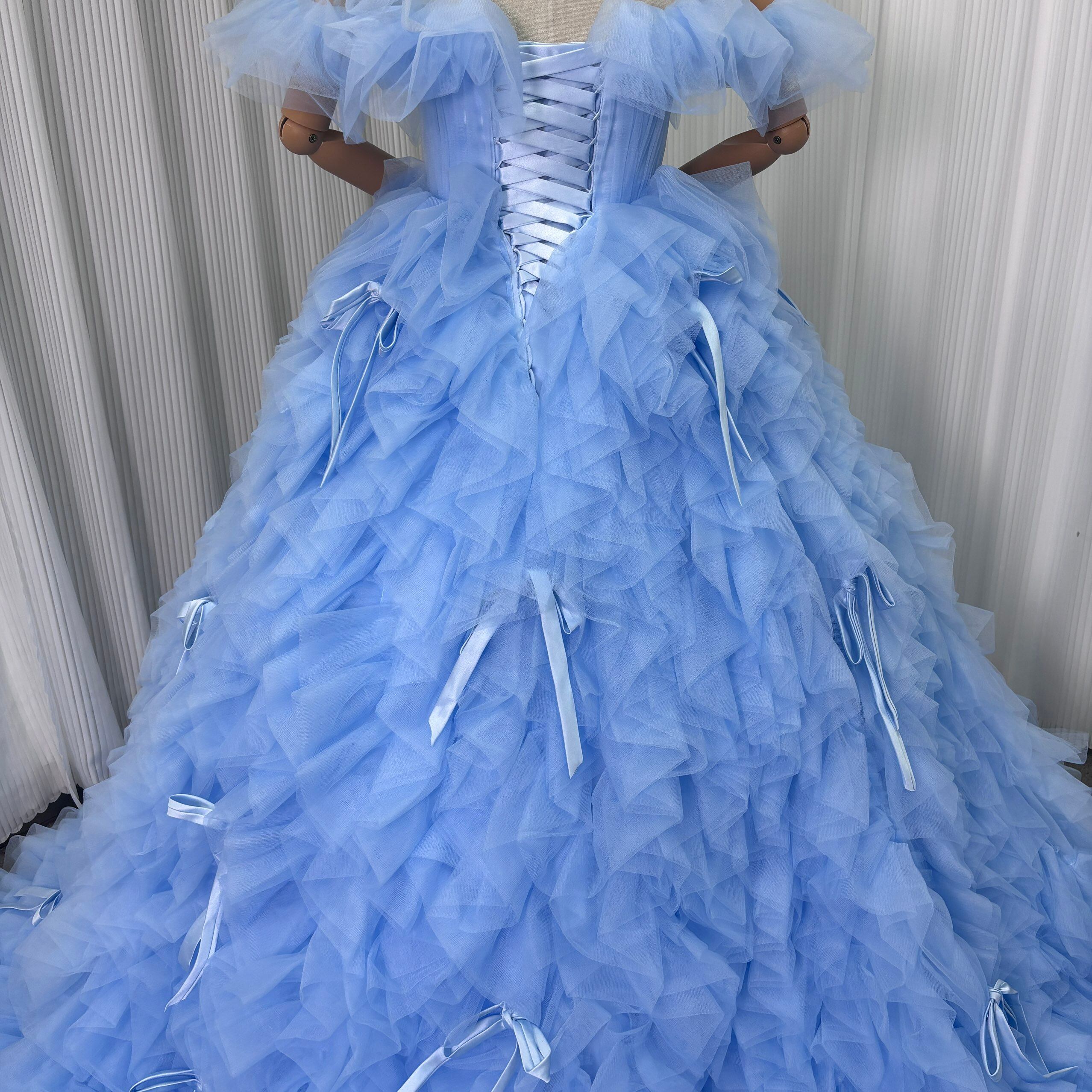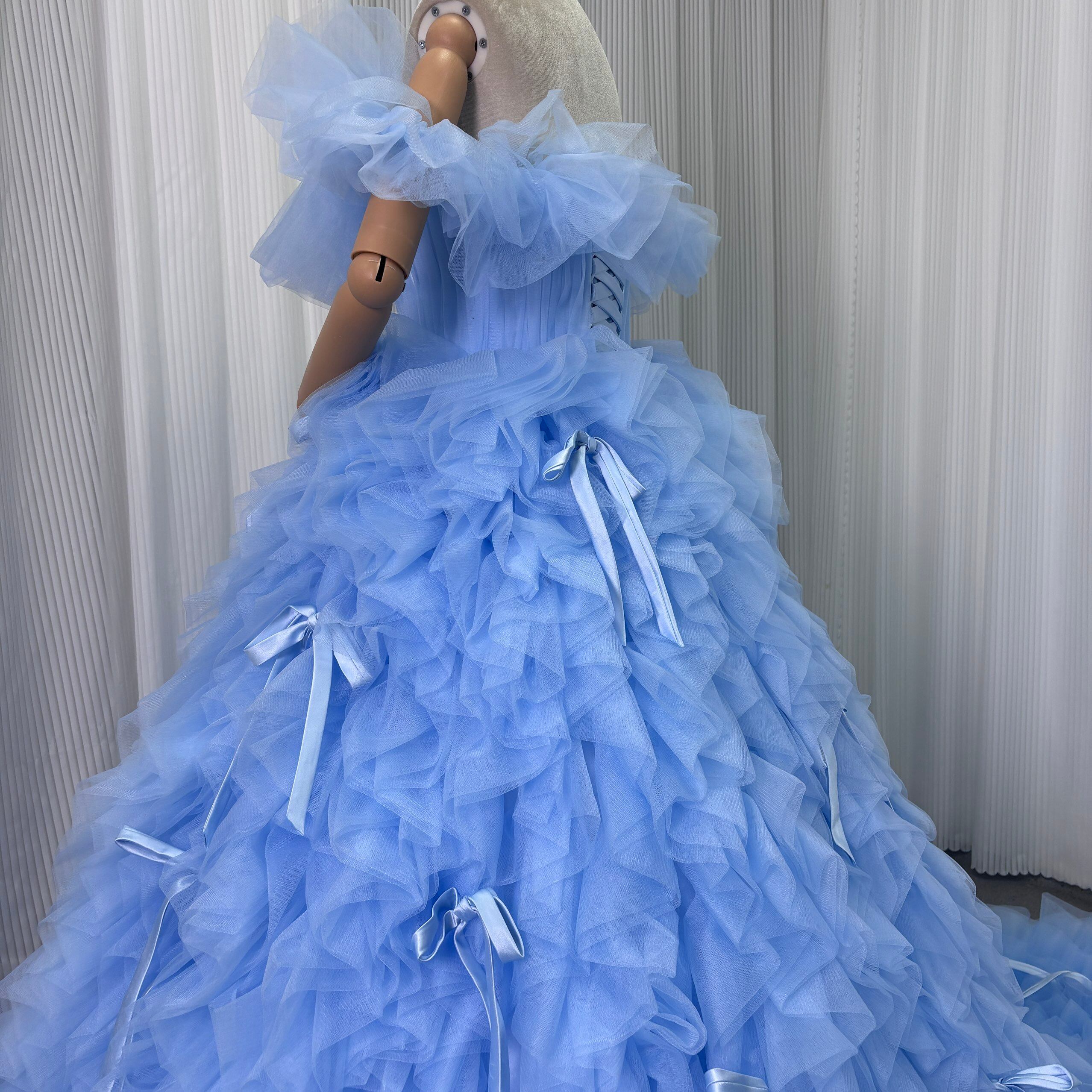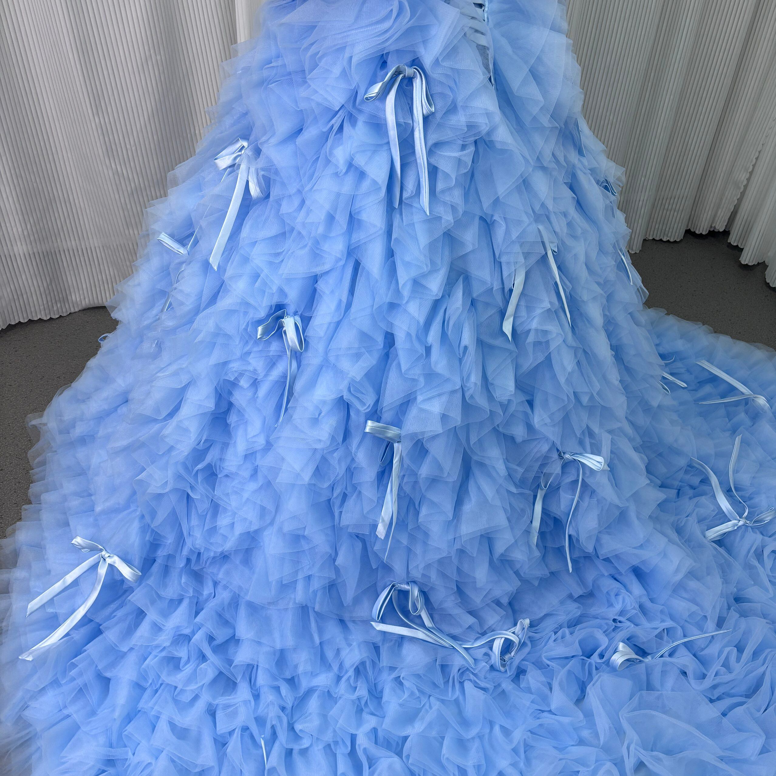 カラードレス 爽やかで優しいブルー オフショルダー リボン ボリュームドレス 華やかなトレーン 可愛い 花嫁