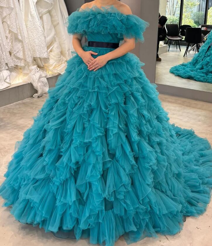 カラードレス グリーン オフショルダー サッシュベルト 華やかなトレーン ボリュームドレス 柔らかく重ねたチュールスカート 花嫁