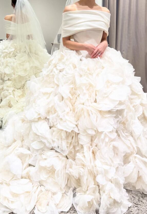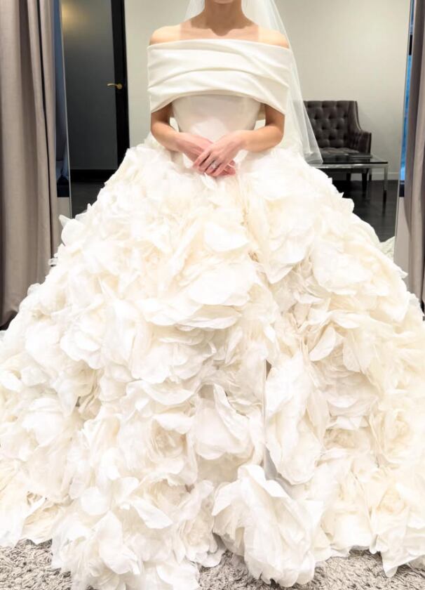 ウエディングドレス オフホワイト アシンメトリー風 オフショルダー 韓国風ドレス 結婚式 前撮り