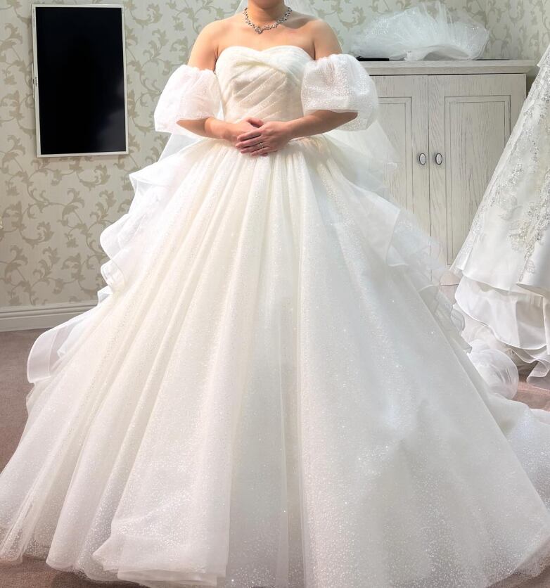 ウエディングドレス オフホワイト オフショルダー スリット 華やかなトレーン 3WAYの着方 ブライダル