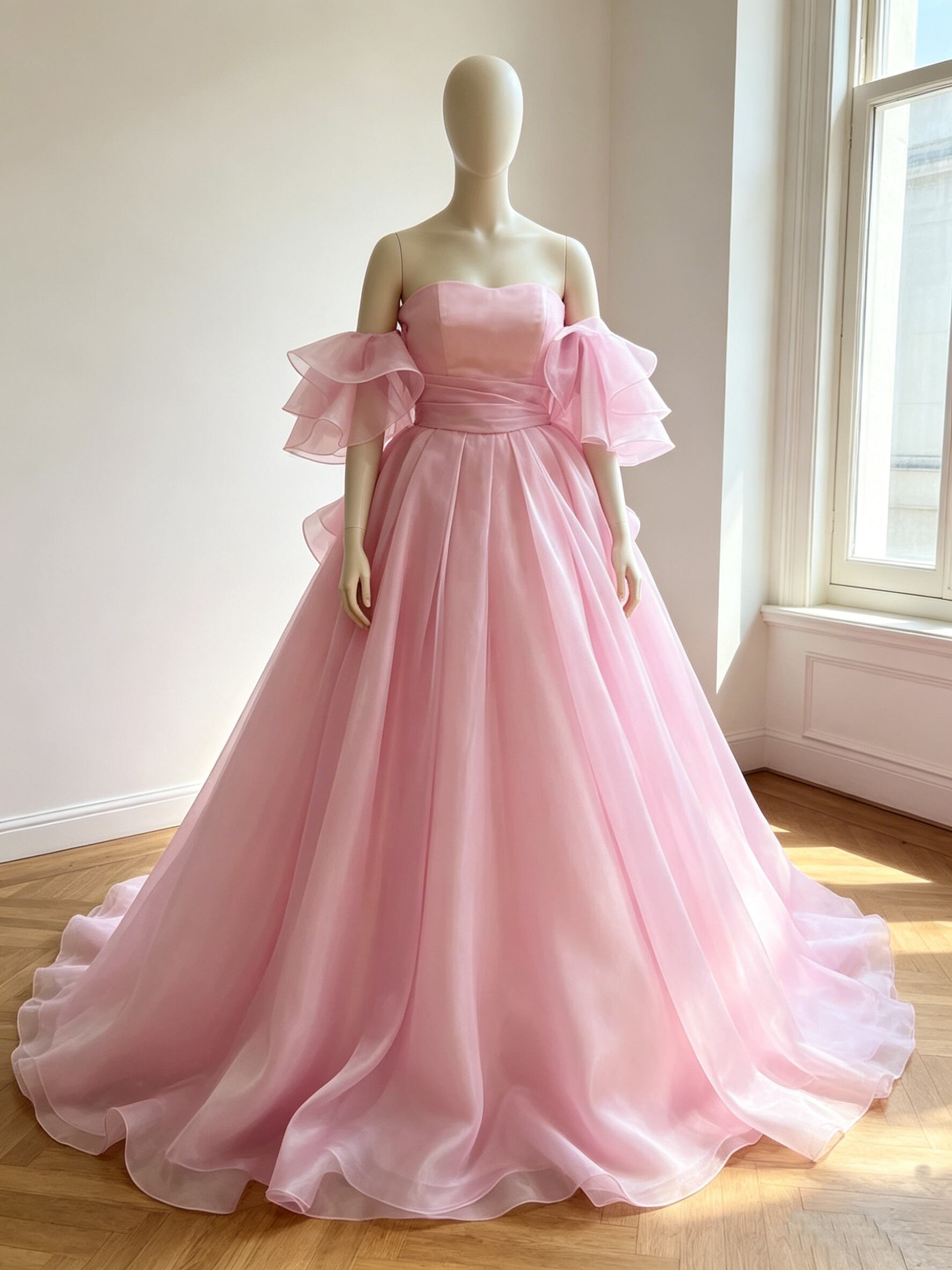 カラードレス ピンク 取り外し可能な付け袖 編み上げ 上質オーガンジー 可愛い 色直し 花嫁