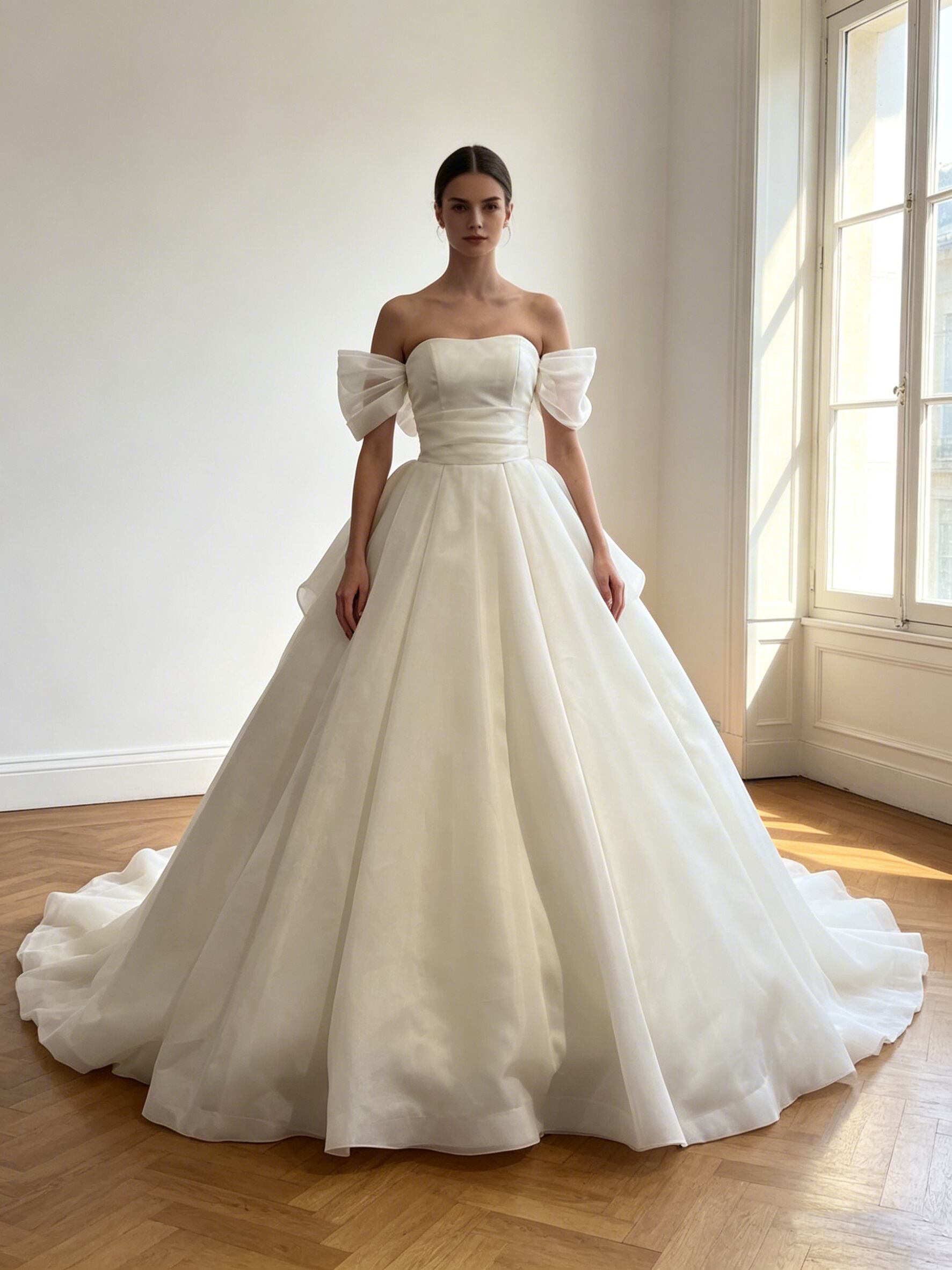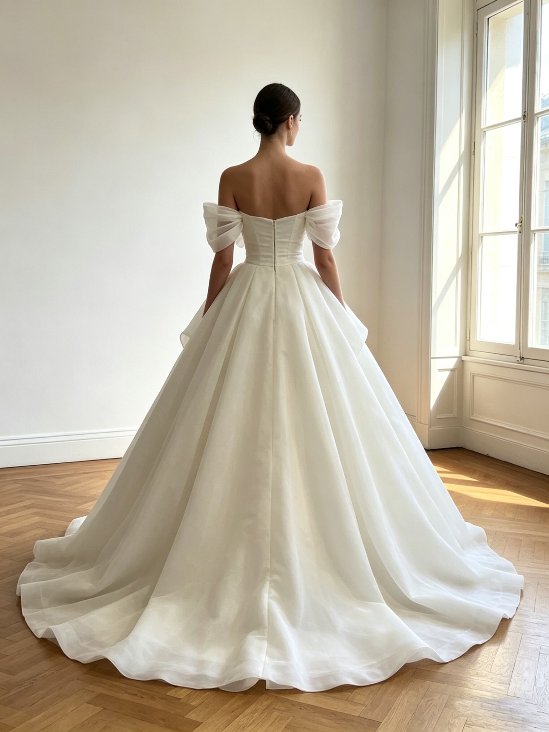 ウエディングドレス オフホワイト ふわふわ袖 上質オーガンジー 華やかなトレーン スリット ブライダル