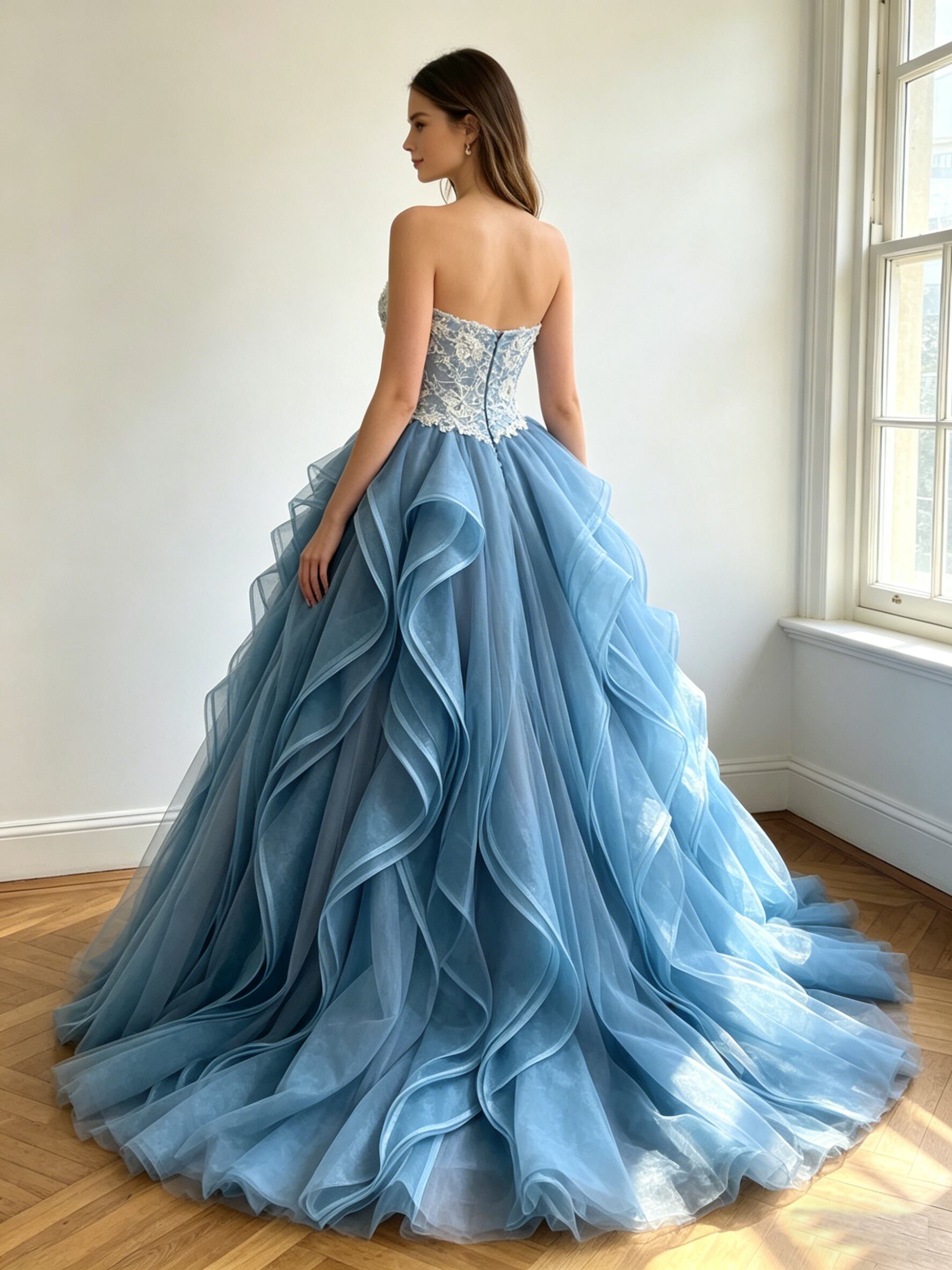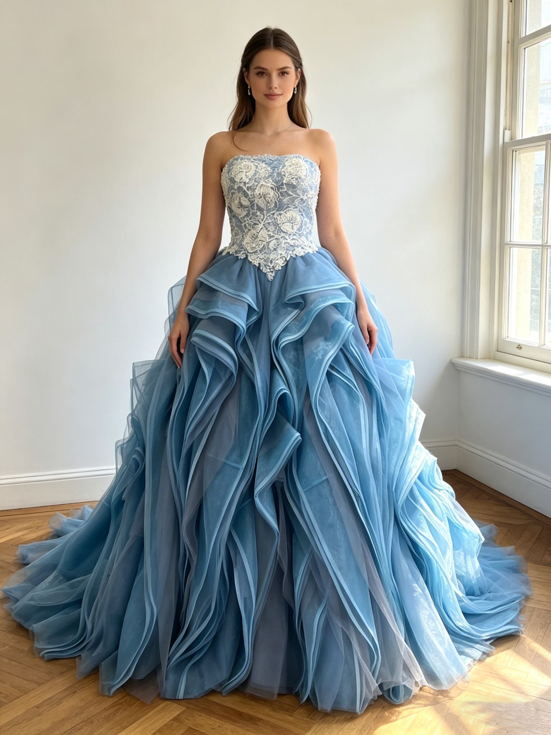 カラードレス 青 ビスチェドレス ラッフルフリル 繊細なレース 韓国風ドレス 花嫁 前撮り
