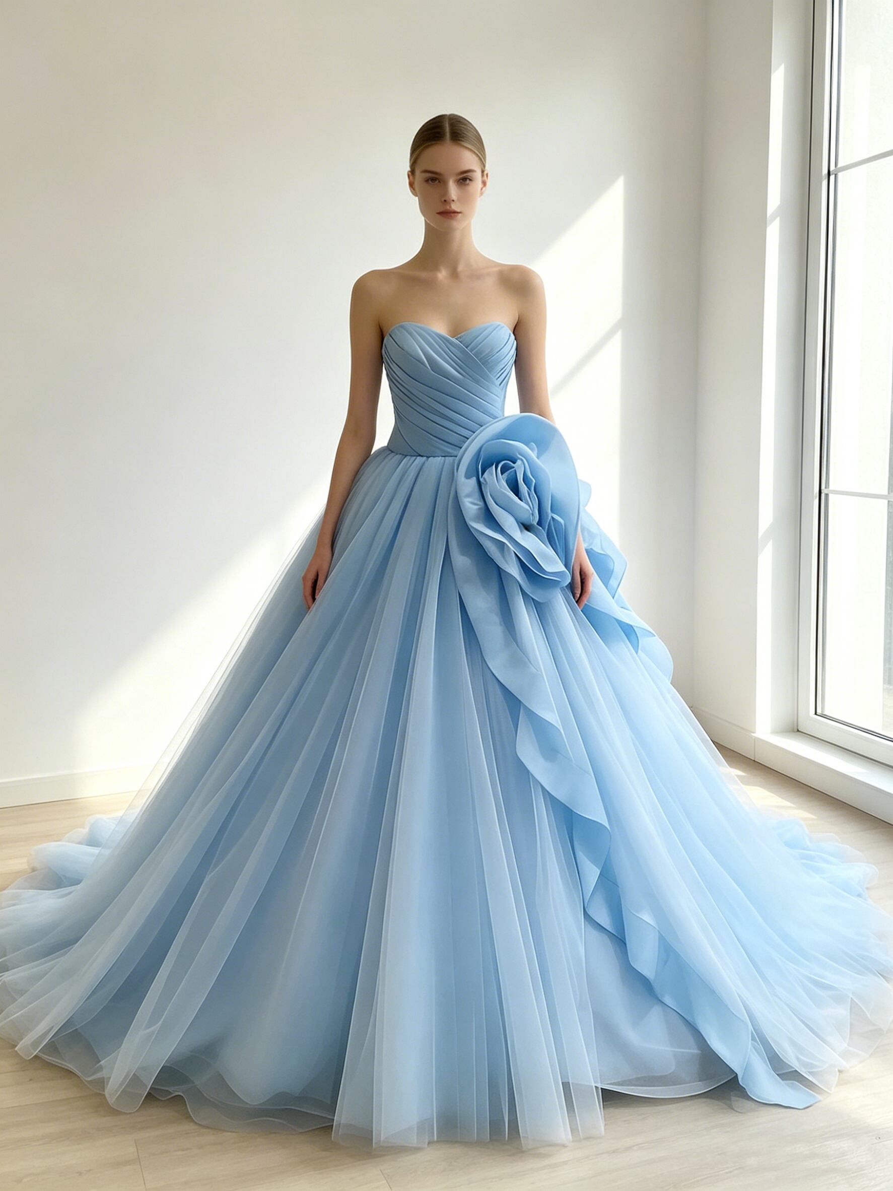 カラードレス 爽やかで優しいブルー バラトレーン 編み上げ ビスチェドレス 華やかなトレーン 花嫁