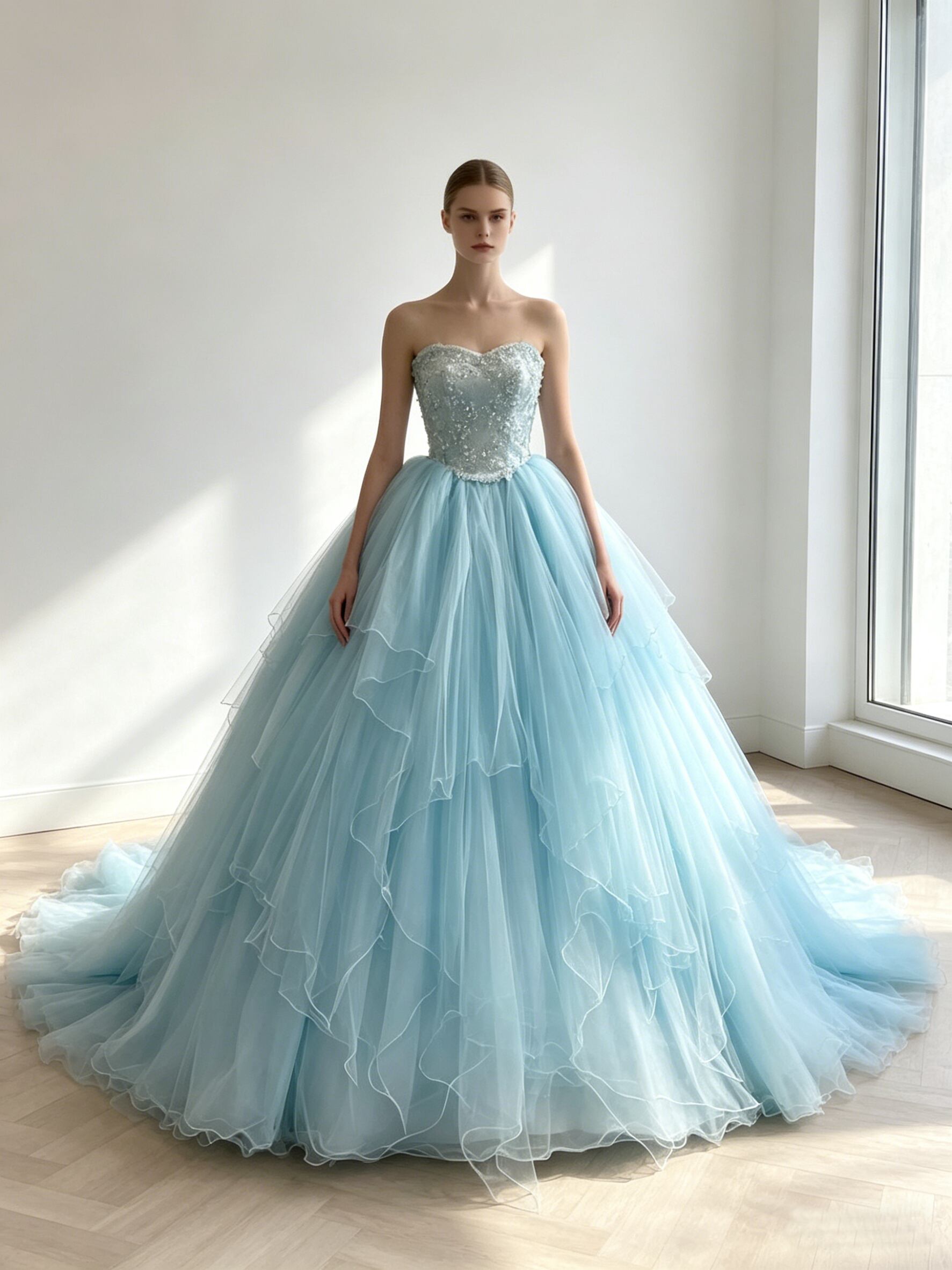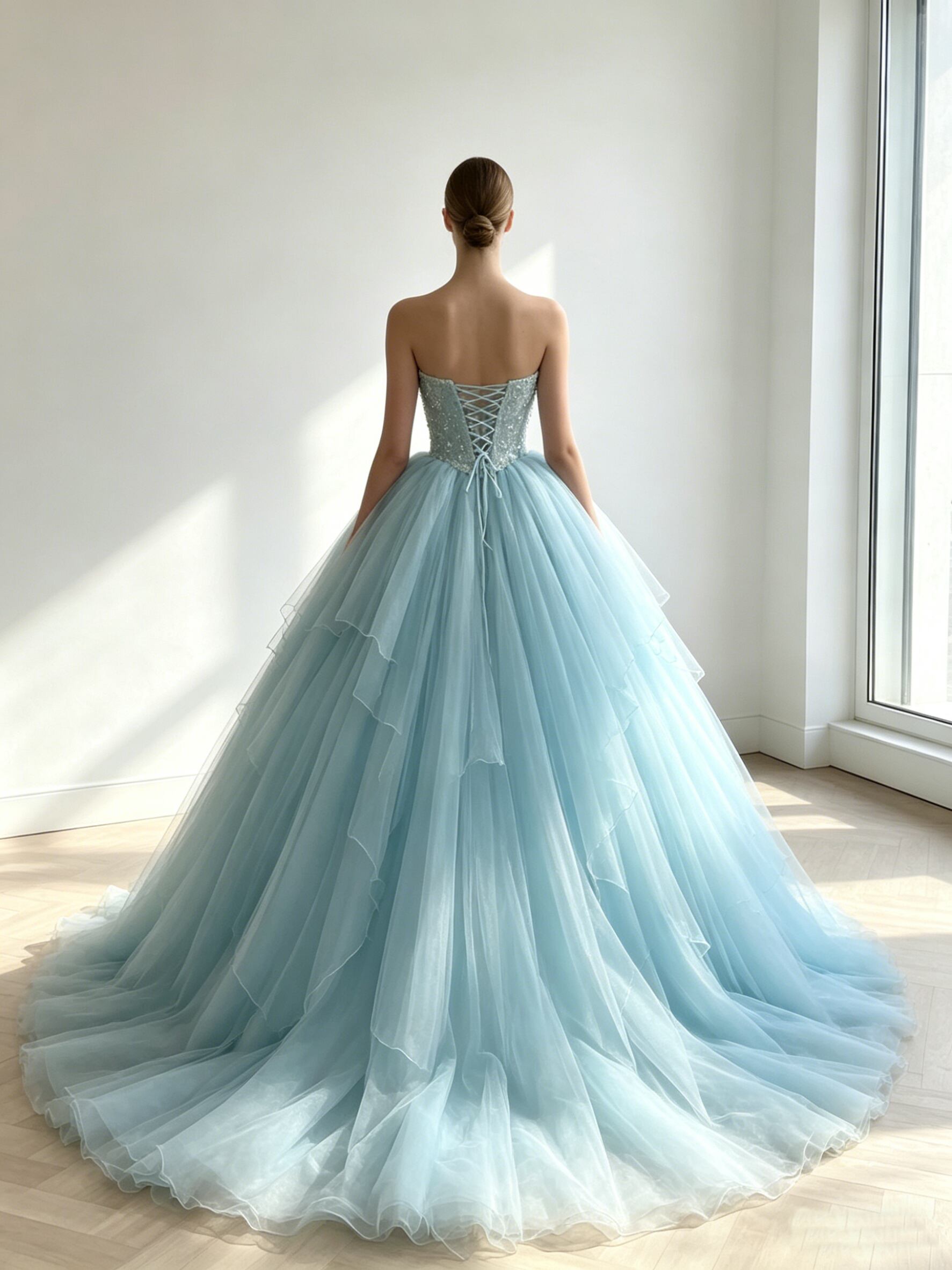 カラードレス 爽やかで優しいブルー チュールドレス ビスチェドレス 華やかなトレーン 編み上げ 花嫁 前撮り