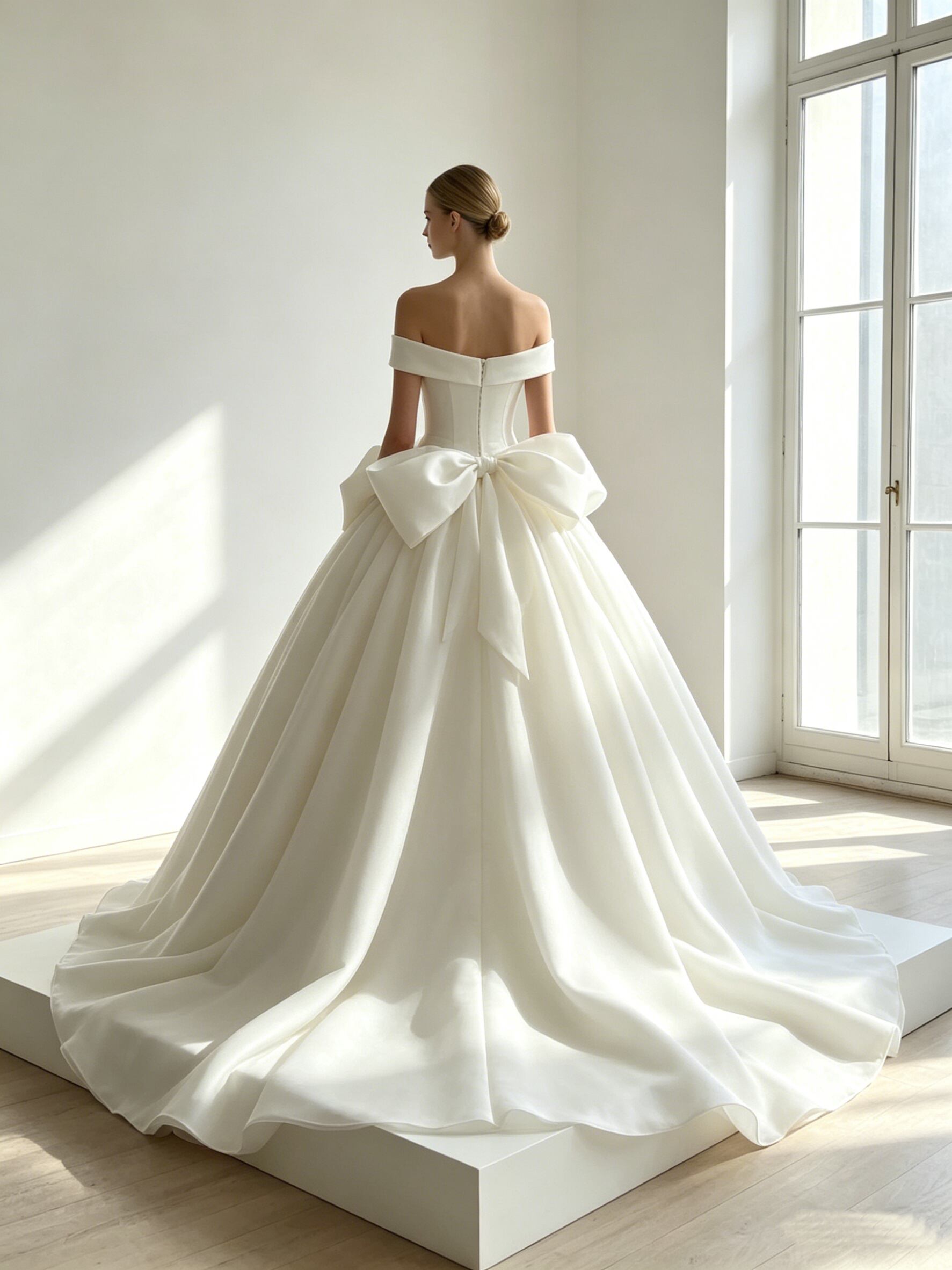 ウエディングドレス オフホワイト オフショルダー ふっくら柔らかなバックリボン 華やかなトレーン ブライダル