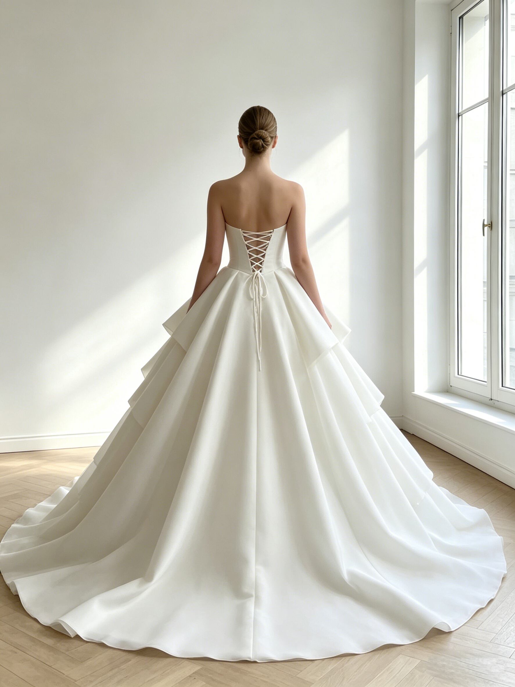 ウエディングドレス オフホワイト ビスチェドレス 編み上げ アシンメトリー風 華やかなトレーン ブライダル