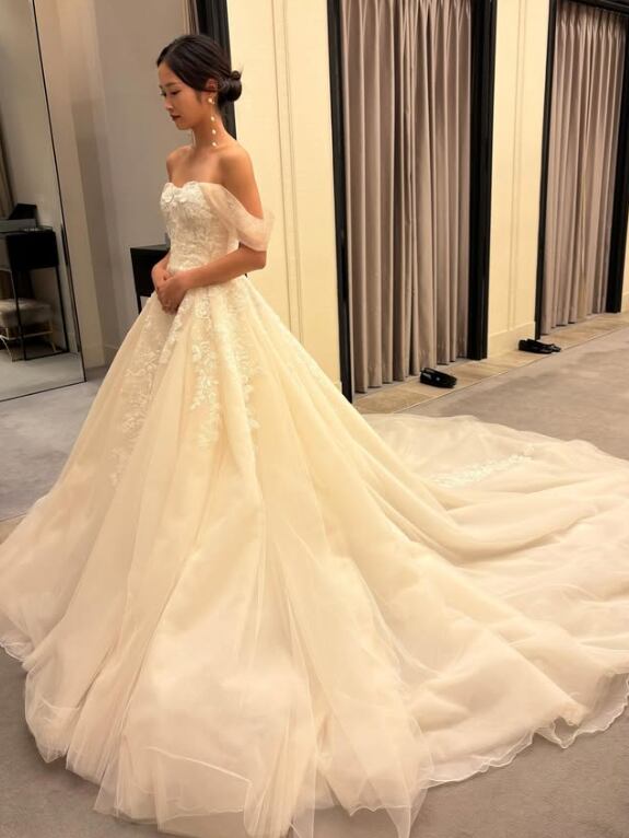 ウエディングドレス オフホワイト オフショルダー 花柄モチーフで刺繍が美しい 華やかなトレーン ファスナー アンティークなドレス 結婚式