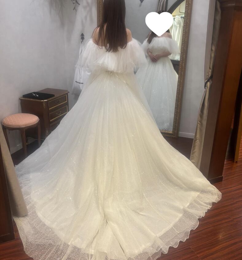 ウエディングドレス オフホワイト 取り外し可能なオフショルダー シークインチュール 華やかなトレーン 結婚式