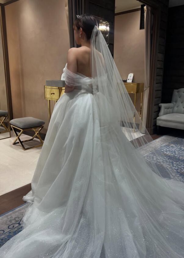 ウエディングドレス オフホワイト オフショルダー シークインチュール ロングトレーン ロングベール 結婚式