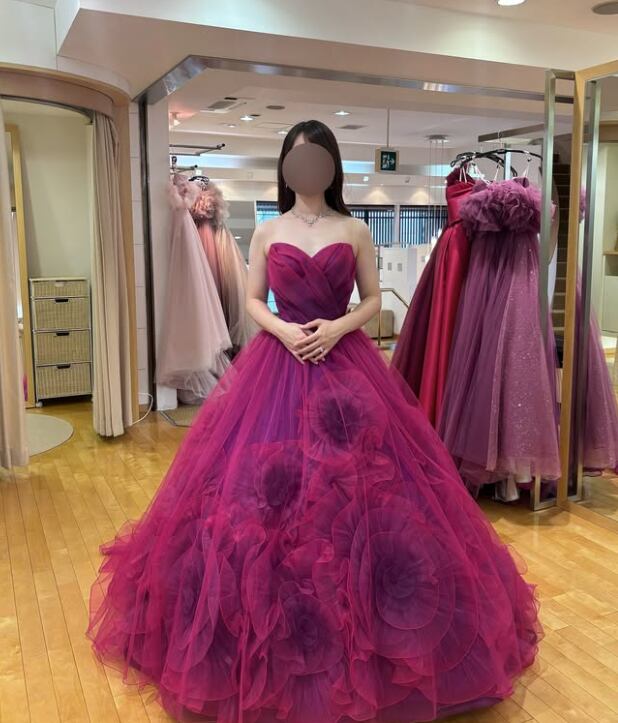 カラードレス ピンク バラトレーン ソフトチュール 華やかなトレーン ビスチェドレス 結婚式