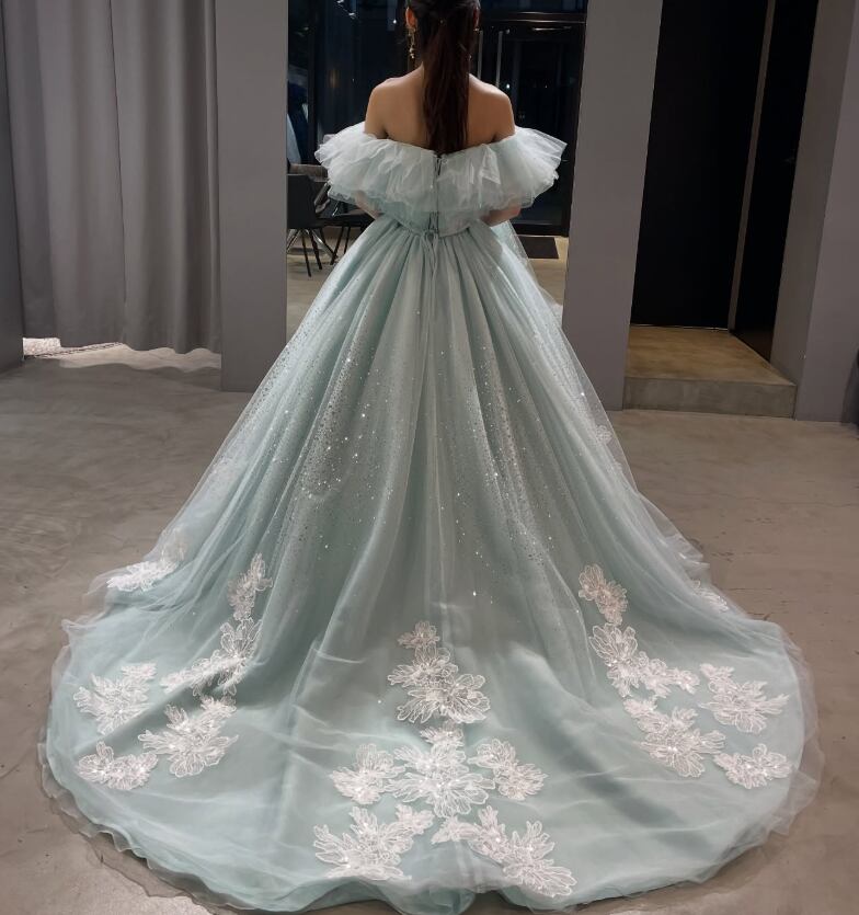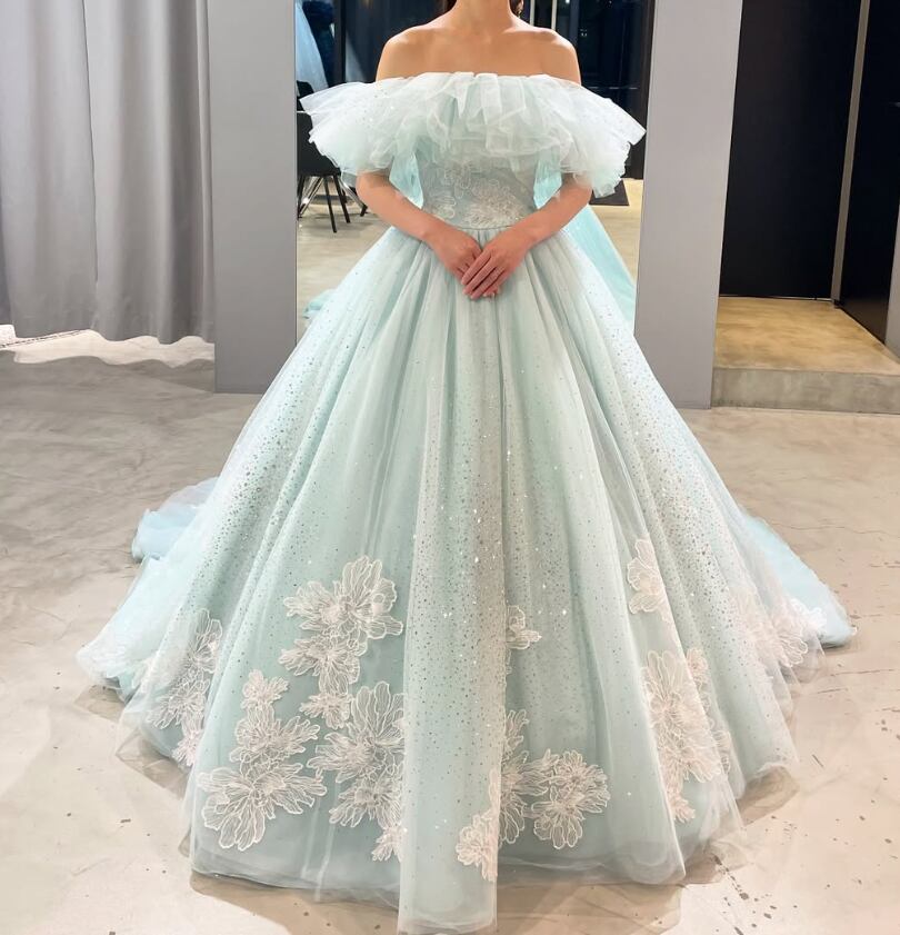 カラードレス 爽やかで優しいブルー 取り外し可能なオフショルダー 花柄モチーフで刺繍が美しい シークインチュール 華やかなトレーン 花嫁