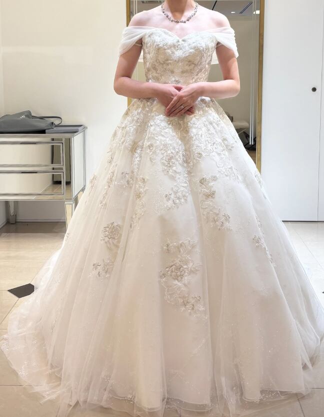 ウエディングドレス オフホワイト オフショルダー 花柄モチーフで刺繍が美しい シークインチュール 華やかなトレーン 結婚式