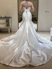 ウエディングドレス オフホワイト 光沢サテン 取り外し可能なオフショルダー ソフトマーメイドライン 華やかなトレーン 結婚式