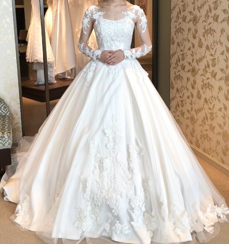 ウエディングドレス オフホワイト 花柄モチーフで刺繍が美しい ロングスリーブ 編み上げ 華やかなトレーン 結婚式