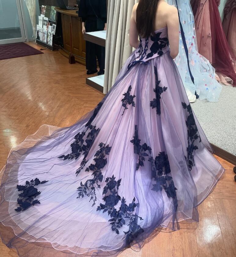 カラードレス パープル 花柄モチーフで刺繍が美しい 編み上げ 華やかなトレーン ビスチェドレス 花嫁 前撮り