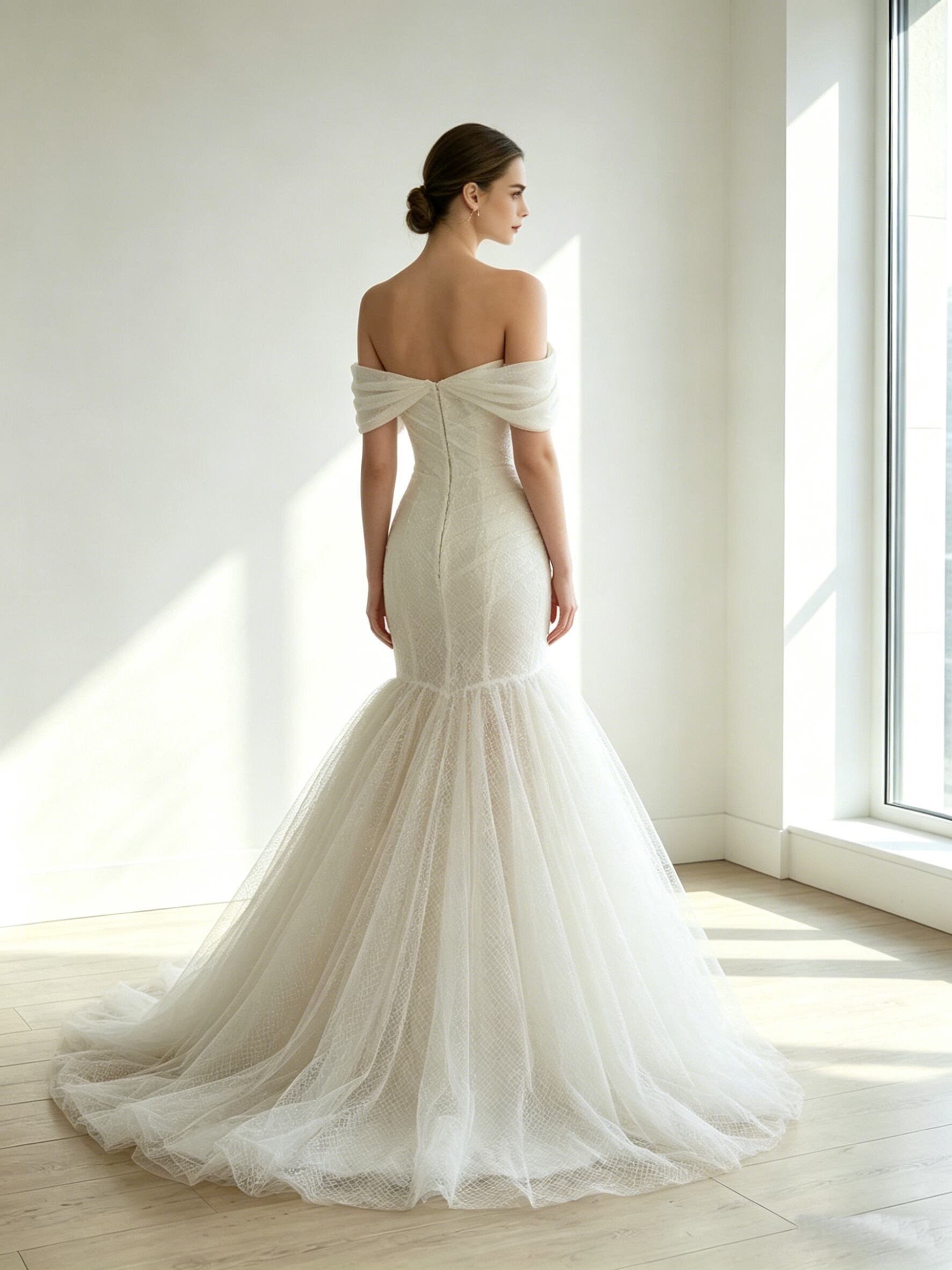 ウエディングドレス オフホワイト オフショルダー スリット マーメイドライン ソフトチュール 披露宴/結婚式