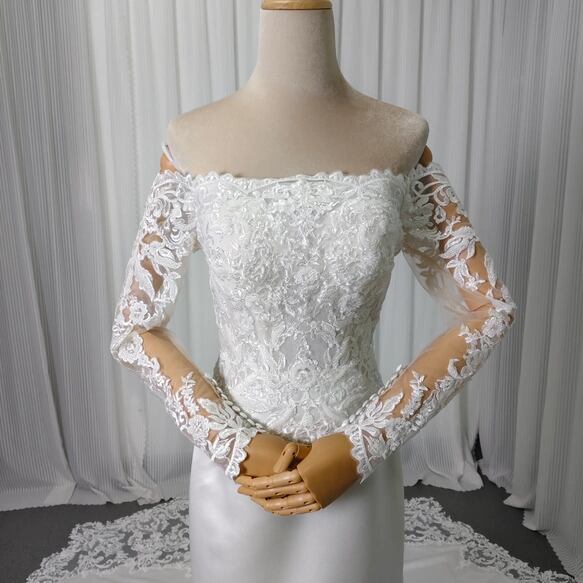 実例写真!ウエディングドレス オフホワイト 韓国風ドレス オフショルダー 光沢サテン 繊細なレース ロングスリーブ ブライダル