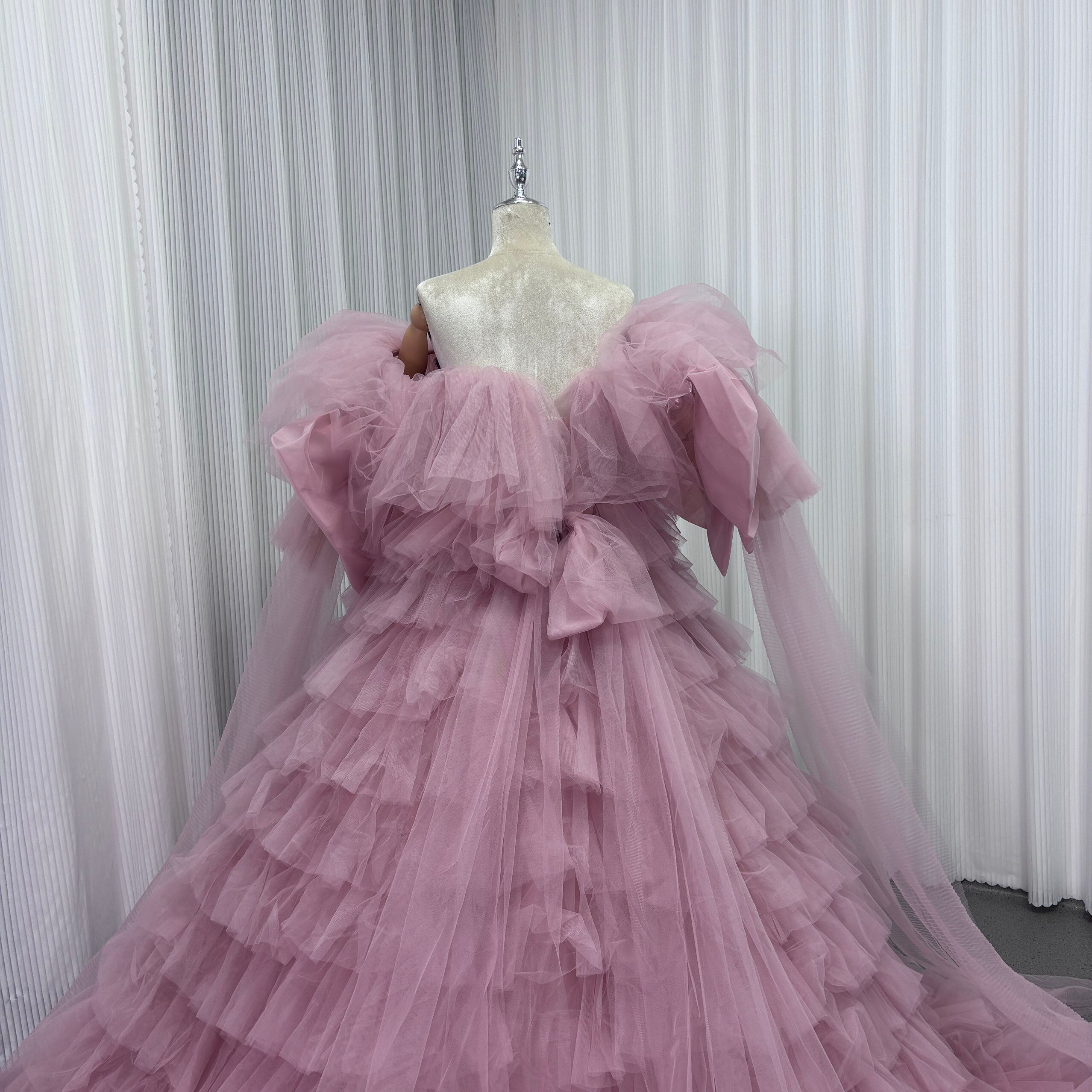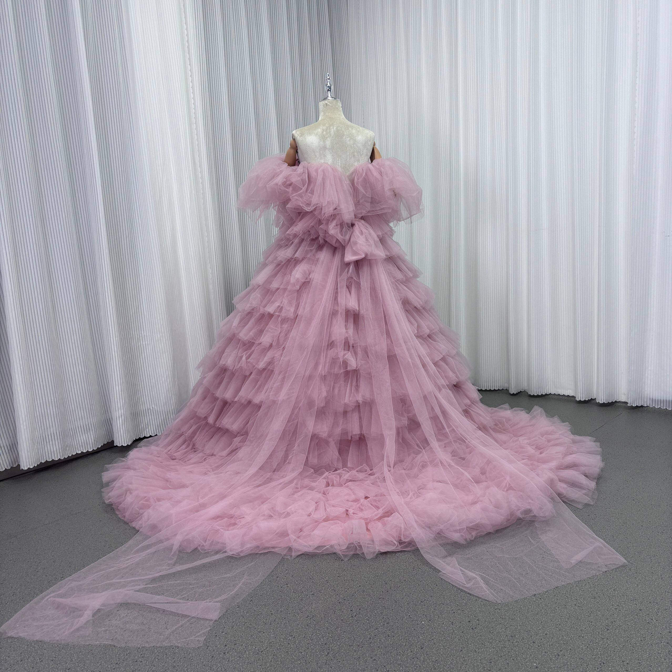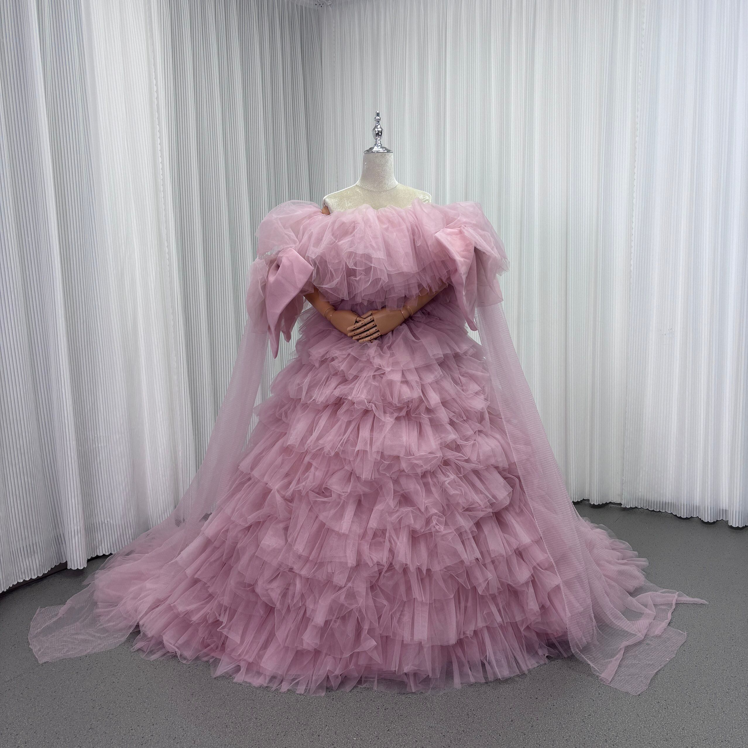 カラードレス ピンク オフショルダー 取り外し可能な付け袖 リボン チュールドレス ファスナー 結婚式 前撮り