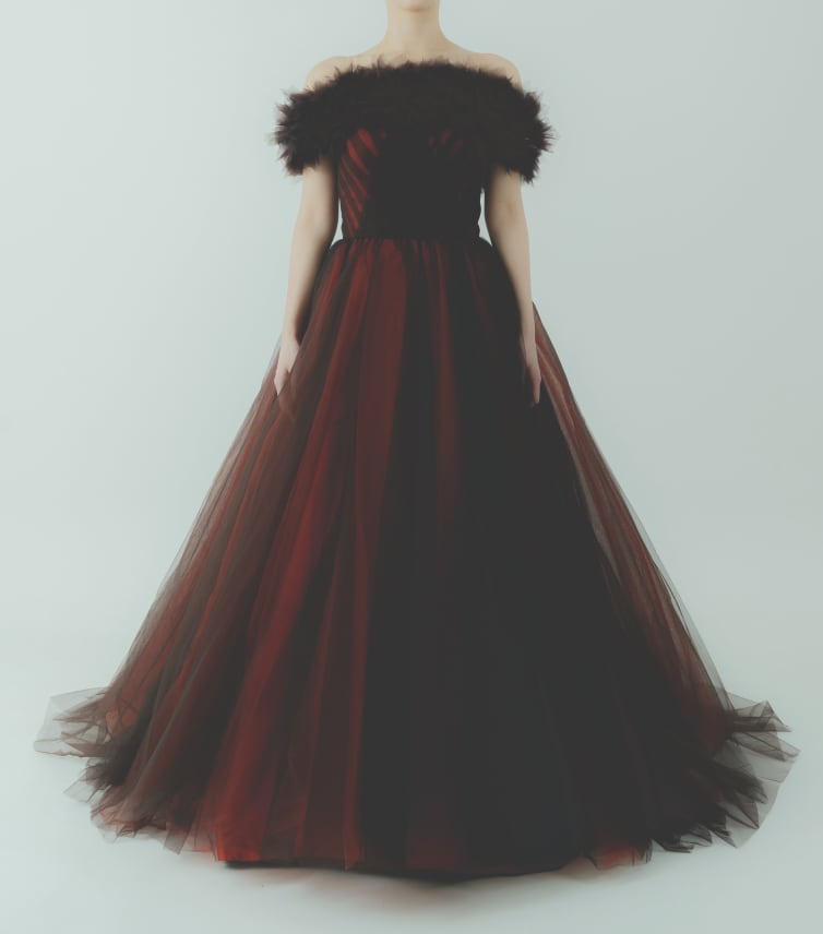 カラードレス ボルドー色 取り外し可能なオフショルダー スリット ロングトレーン 花嫁 前撮り