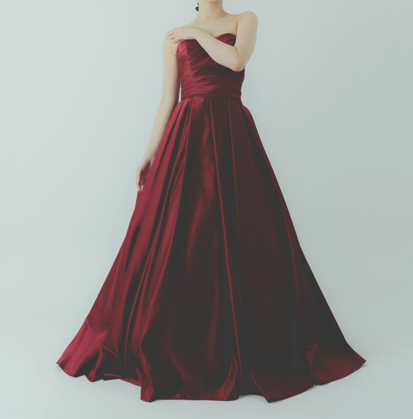 カラードレス ボルドー色 取り外し可能な付け袖 光沢サテン スリット 編み上げ 華やかなトレーン 花嫁 前撮り