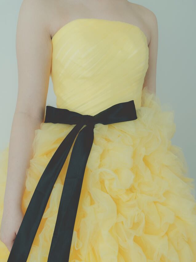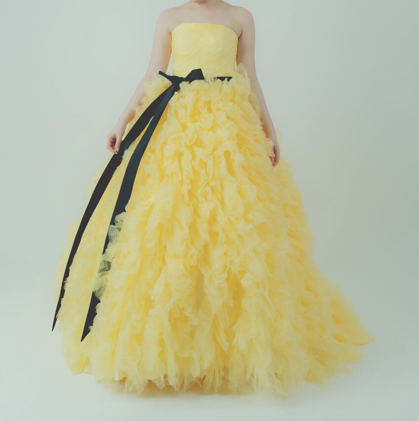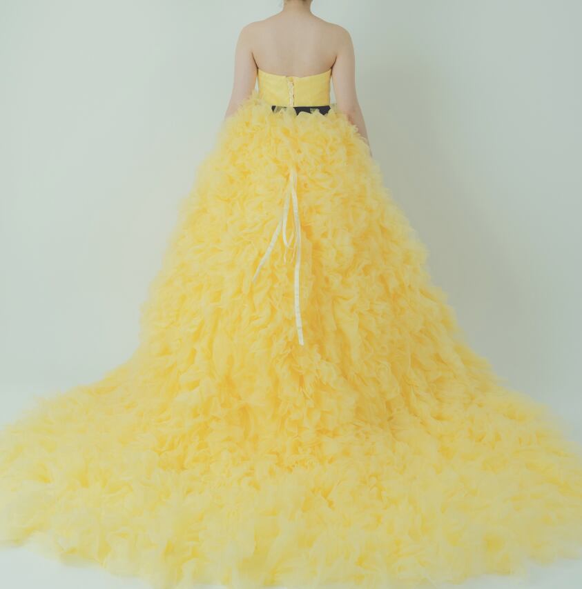 カラードレス 黄色い ふわふわドレス サッシュベルト ビスチェドレス 華やかなトレーン 花嫁 前撮り