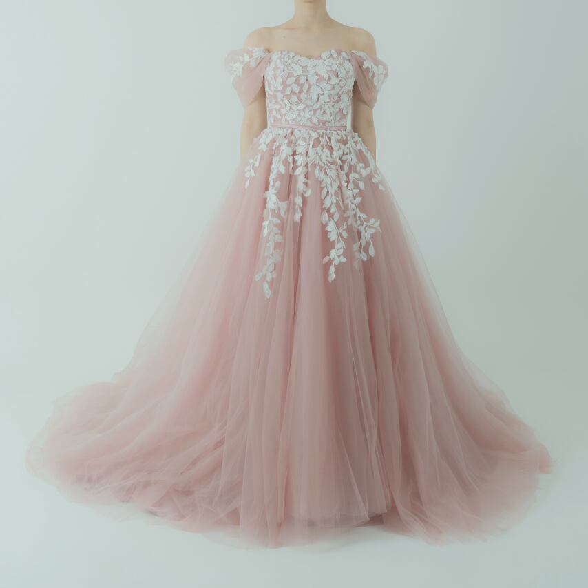 カラードレス ピンク オフショルダー リーフ刺繍 チュールドレス 編み上げ 華やかなトレーン 花嫁 前撮り