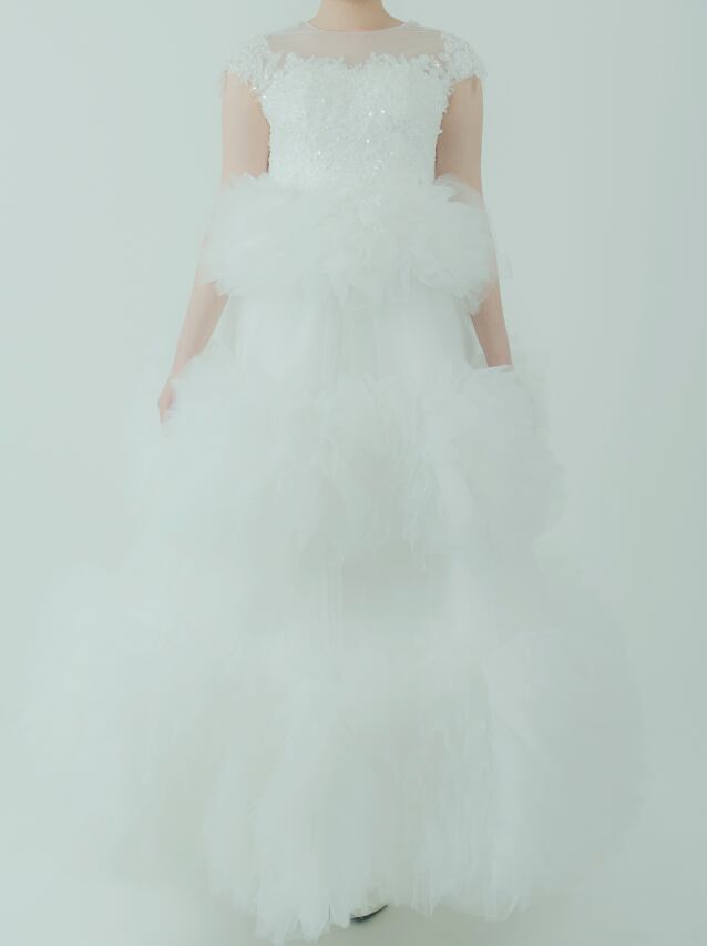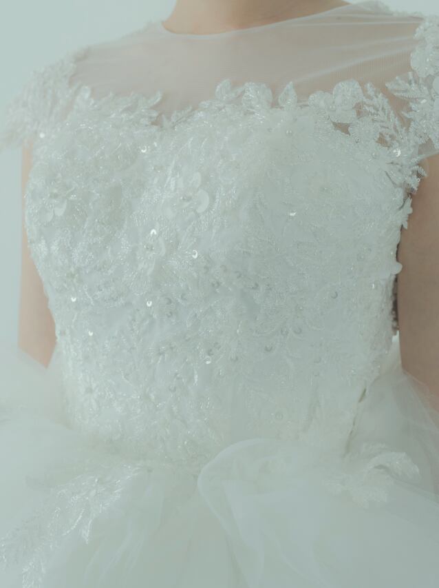 ウエディングドレス オフホワイト ノースリーブ インポートビジューレース バックレス ティアードのドレス 花嫁 前撮り