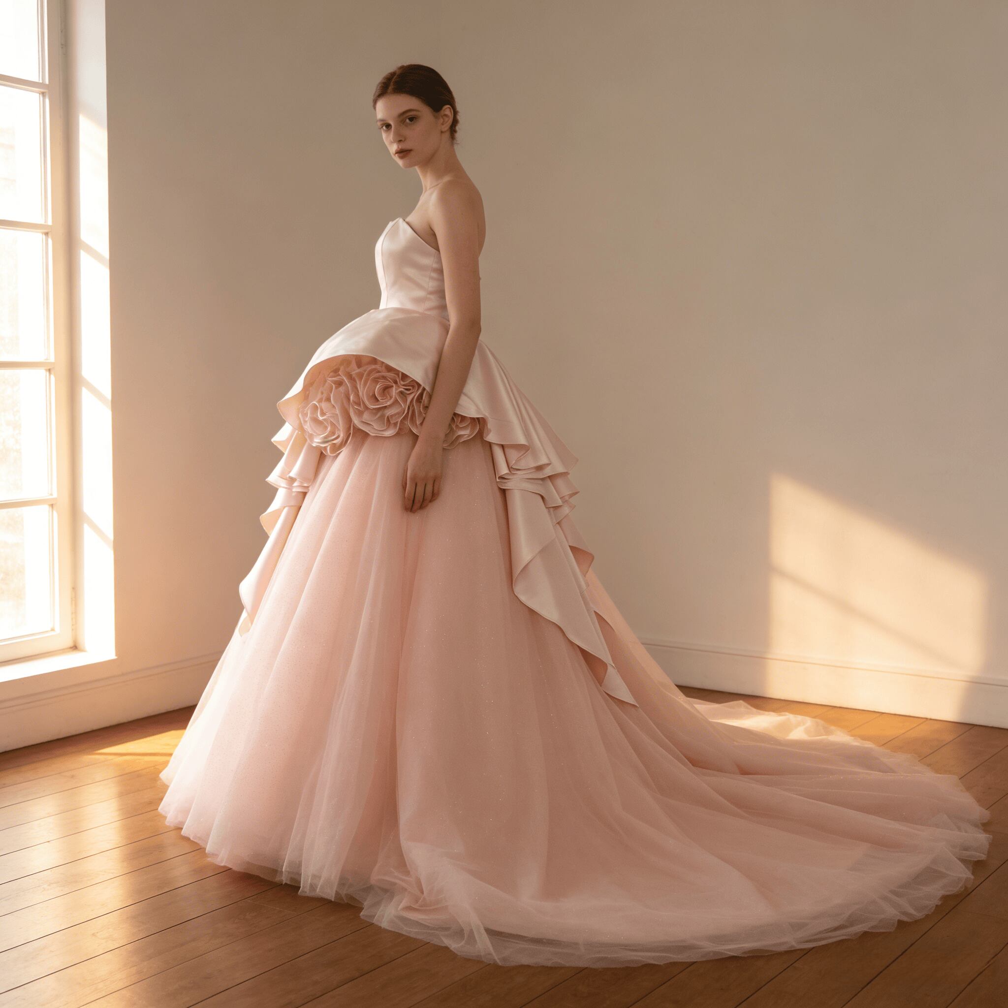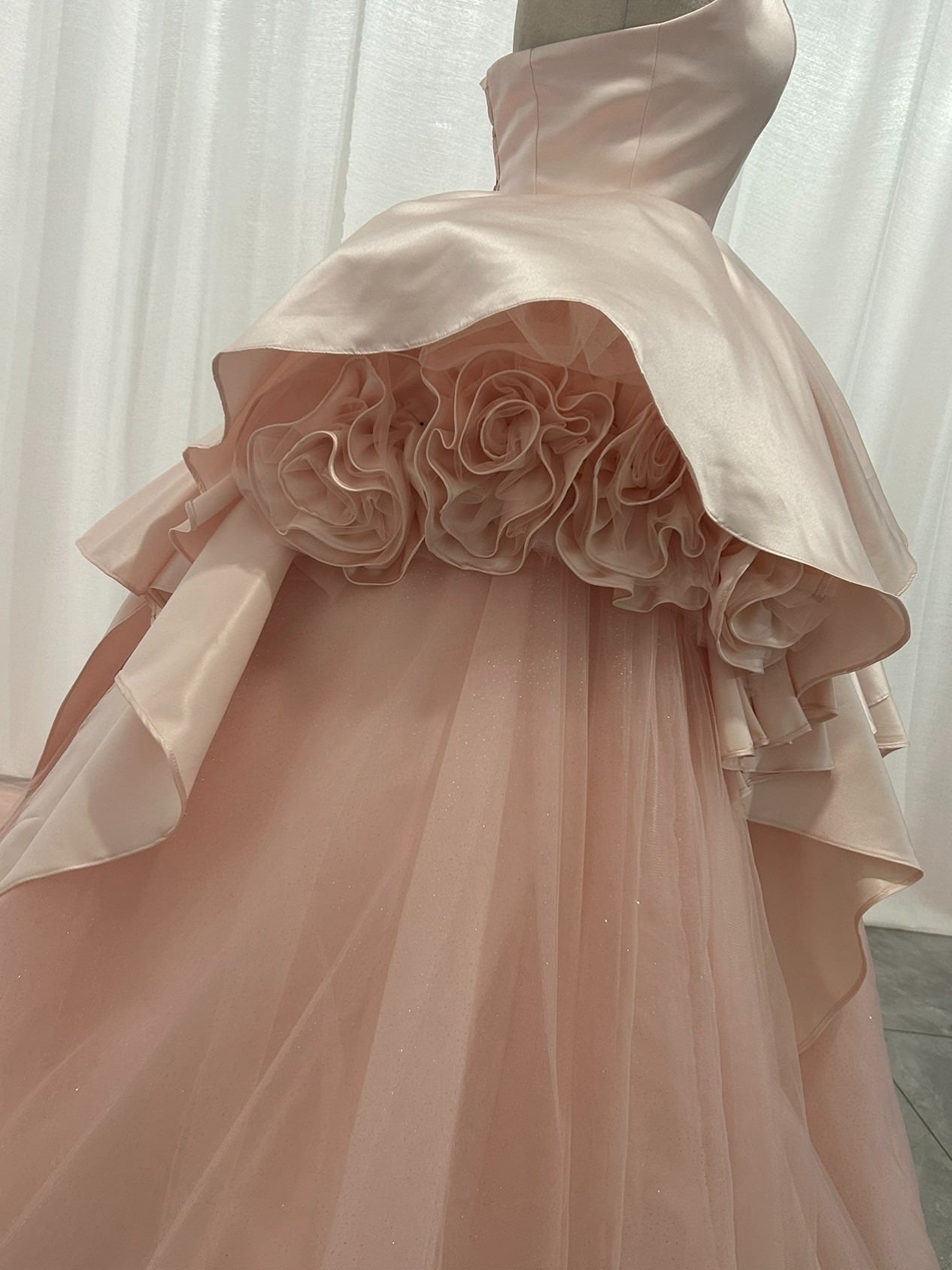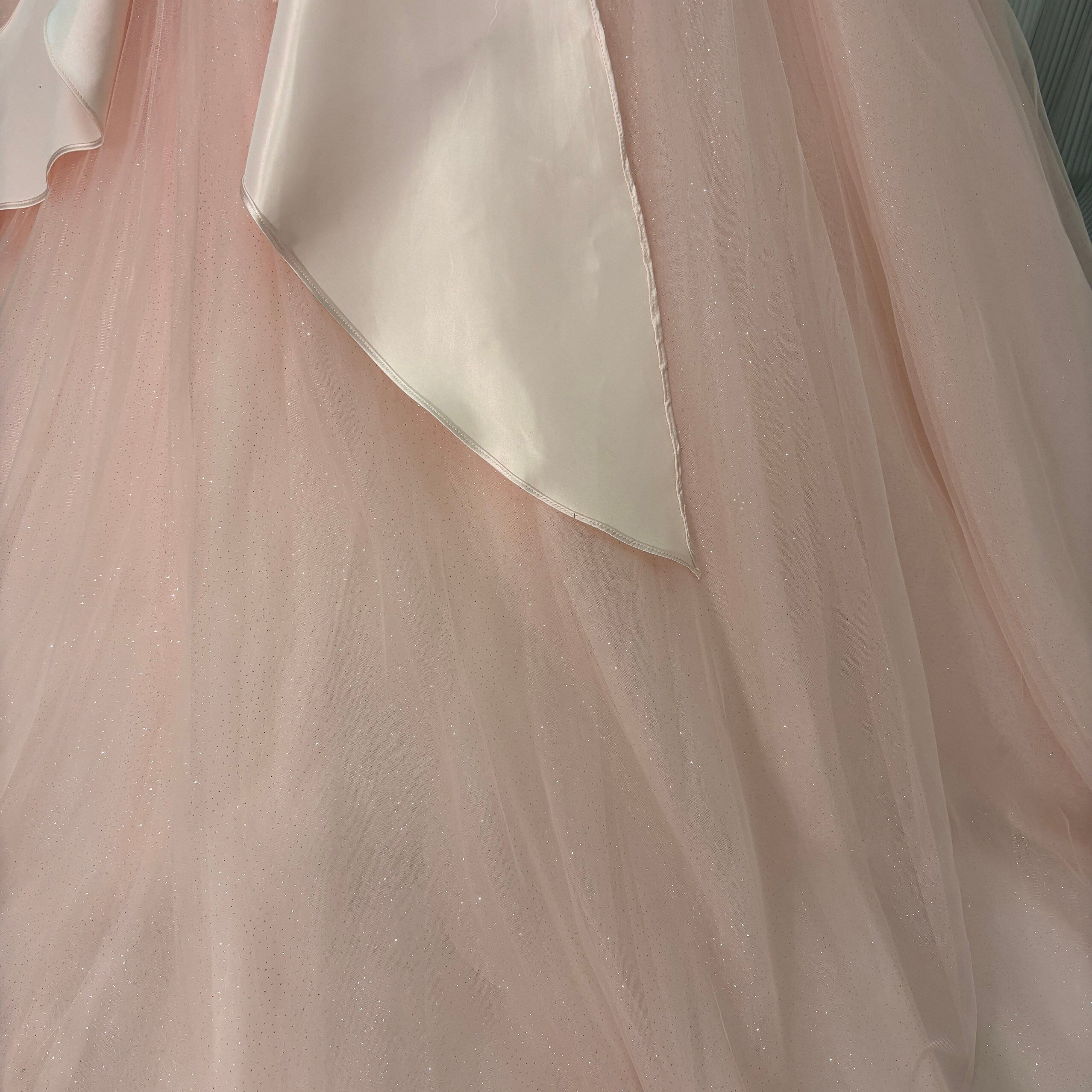 カラードレス パウダーピンク ビスチェドレス バラトレーン シークインチュール 華やかなトレーン 花嫁 前撮り