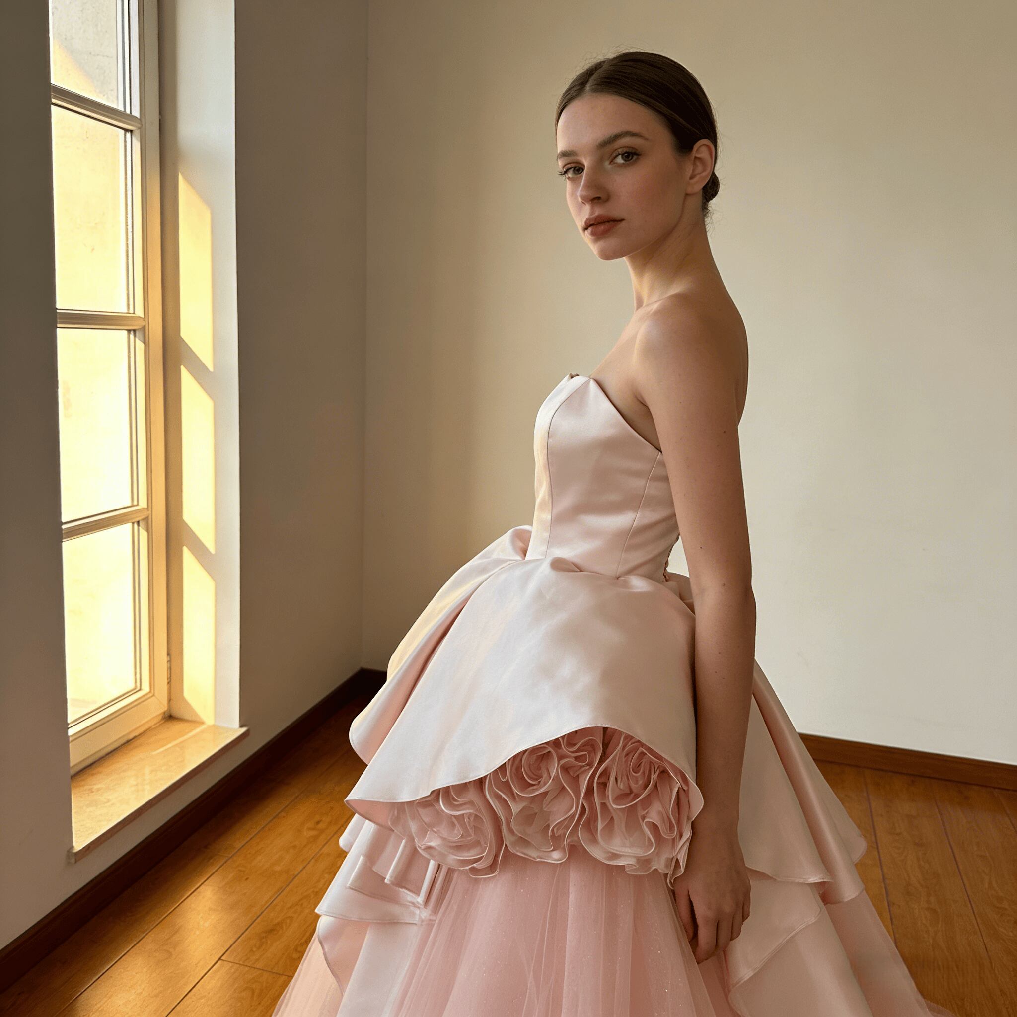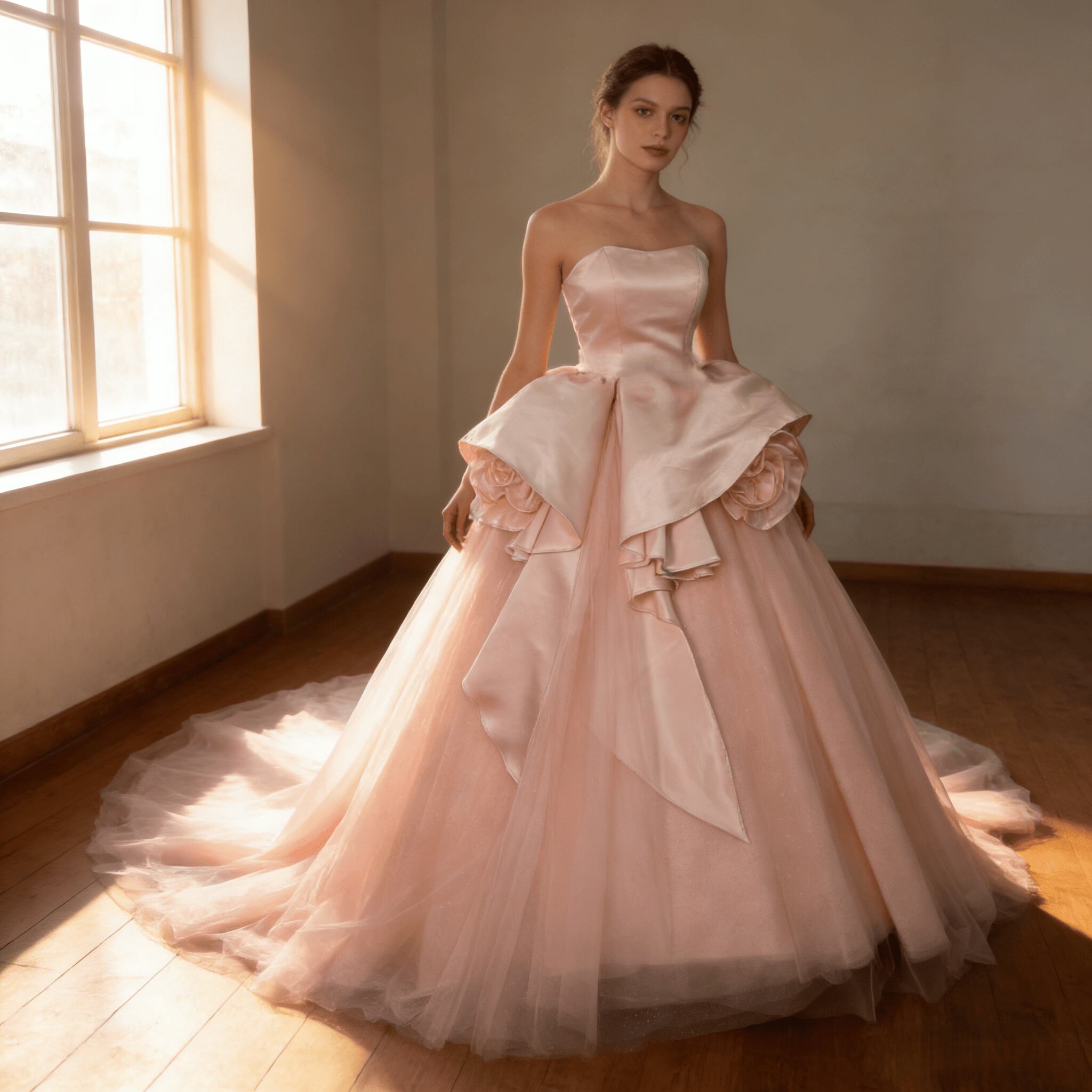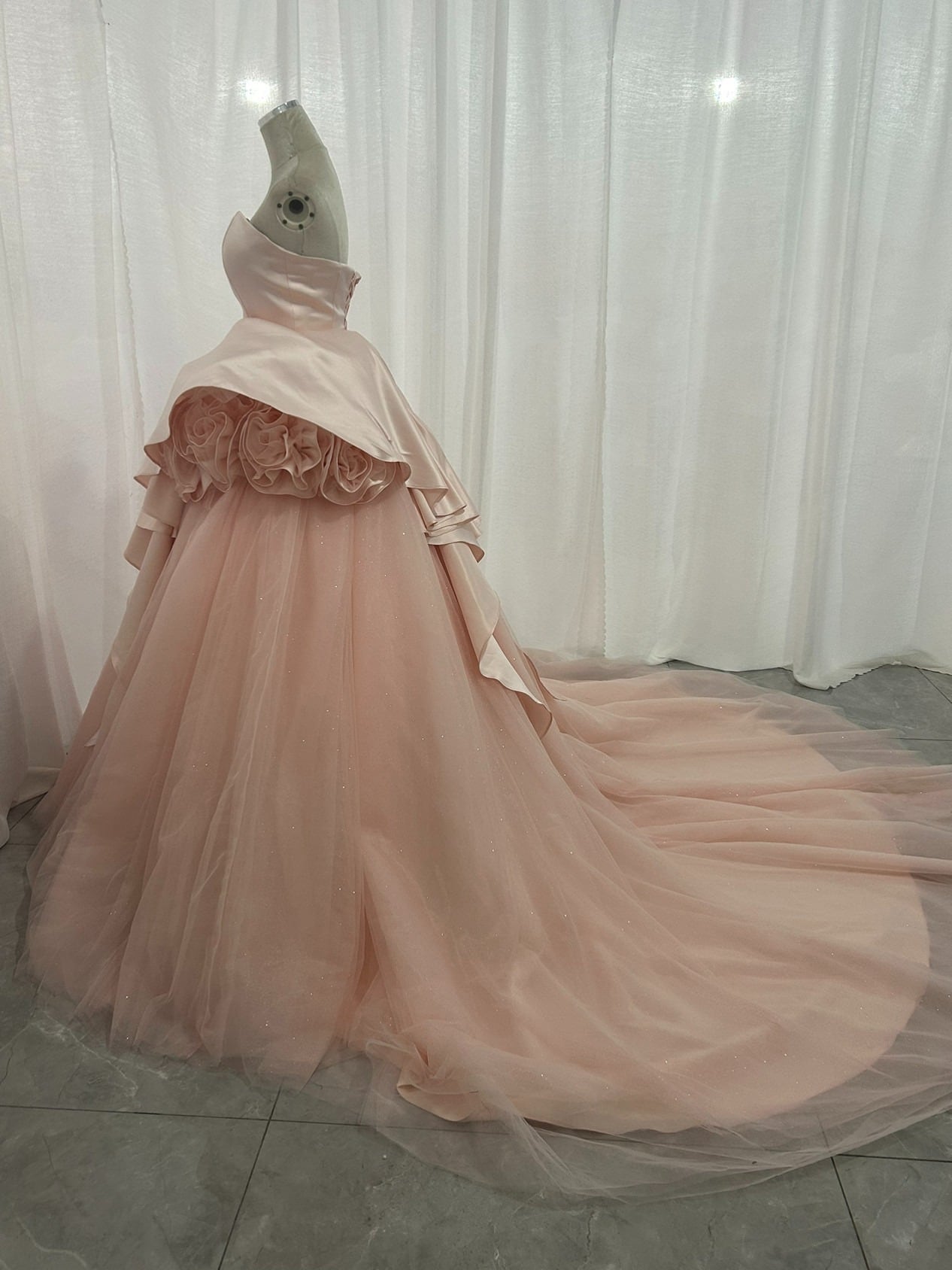 カラードレス パウダーピンク ビスチェドレス バラトレーン シークインチュール 華やかなトレーン 花嫁 前撮り