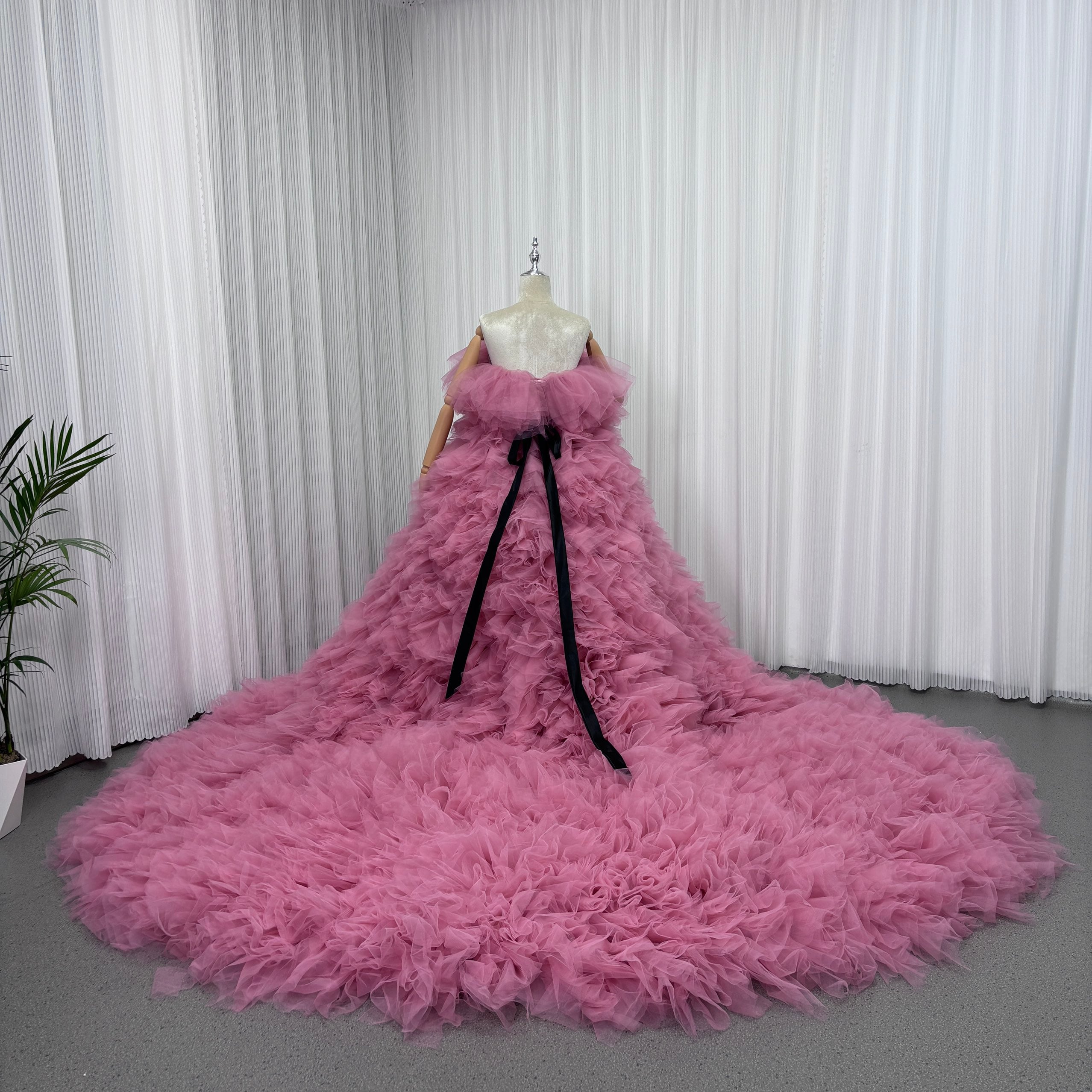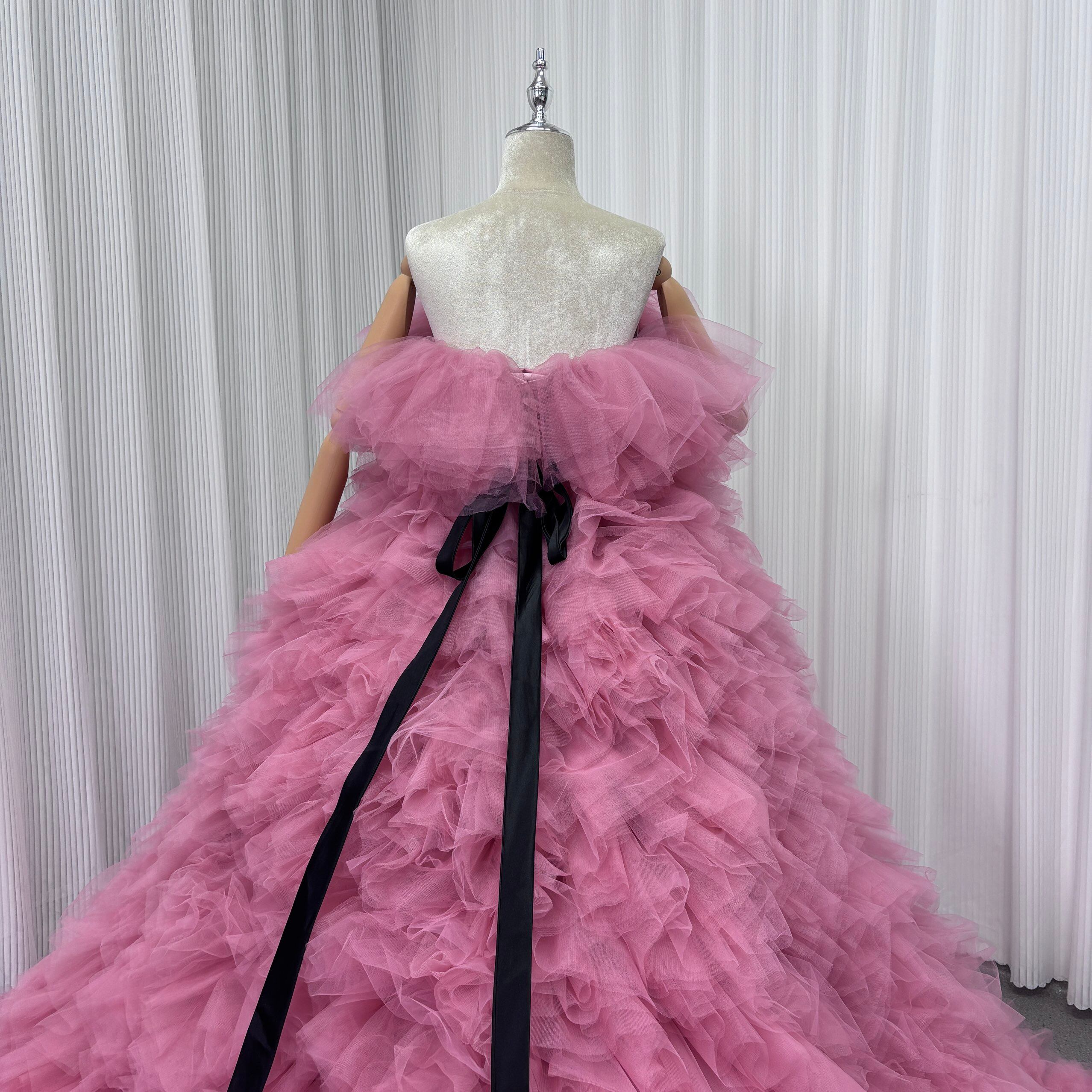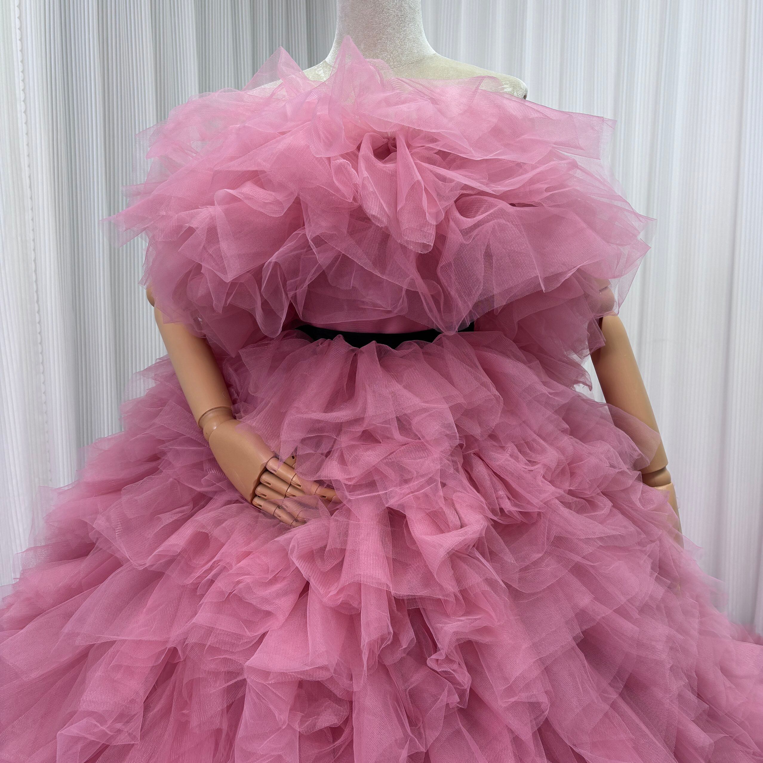 カラードレス ピンク オフショルダー サッシュベルト ふわふわドレス 華やかなトレーン 花嫁 前撮り