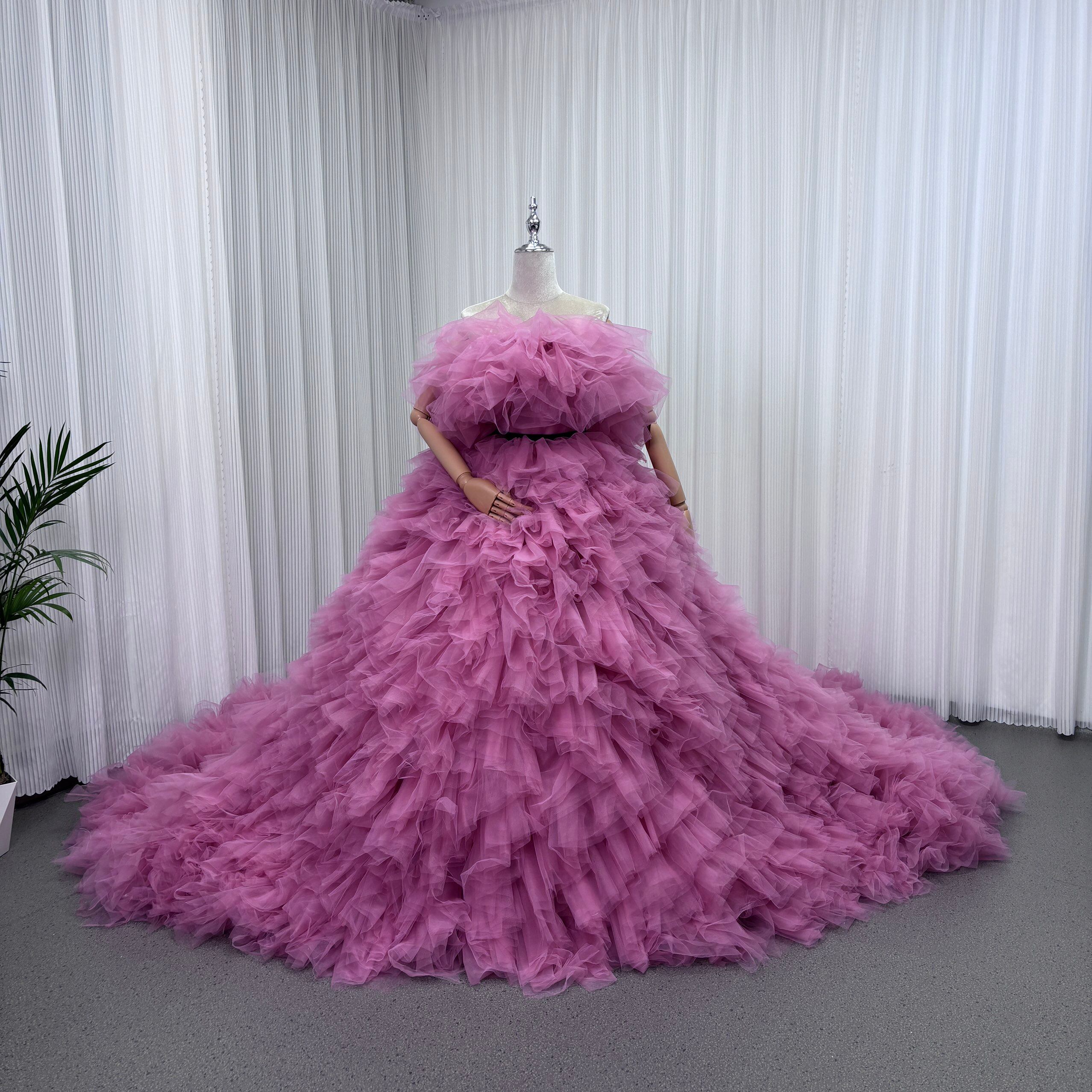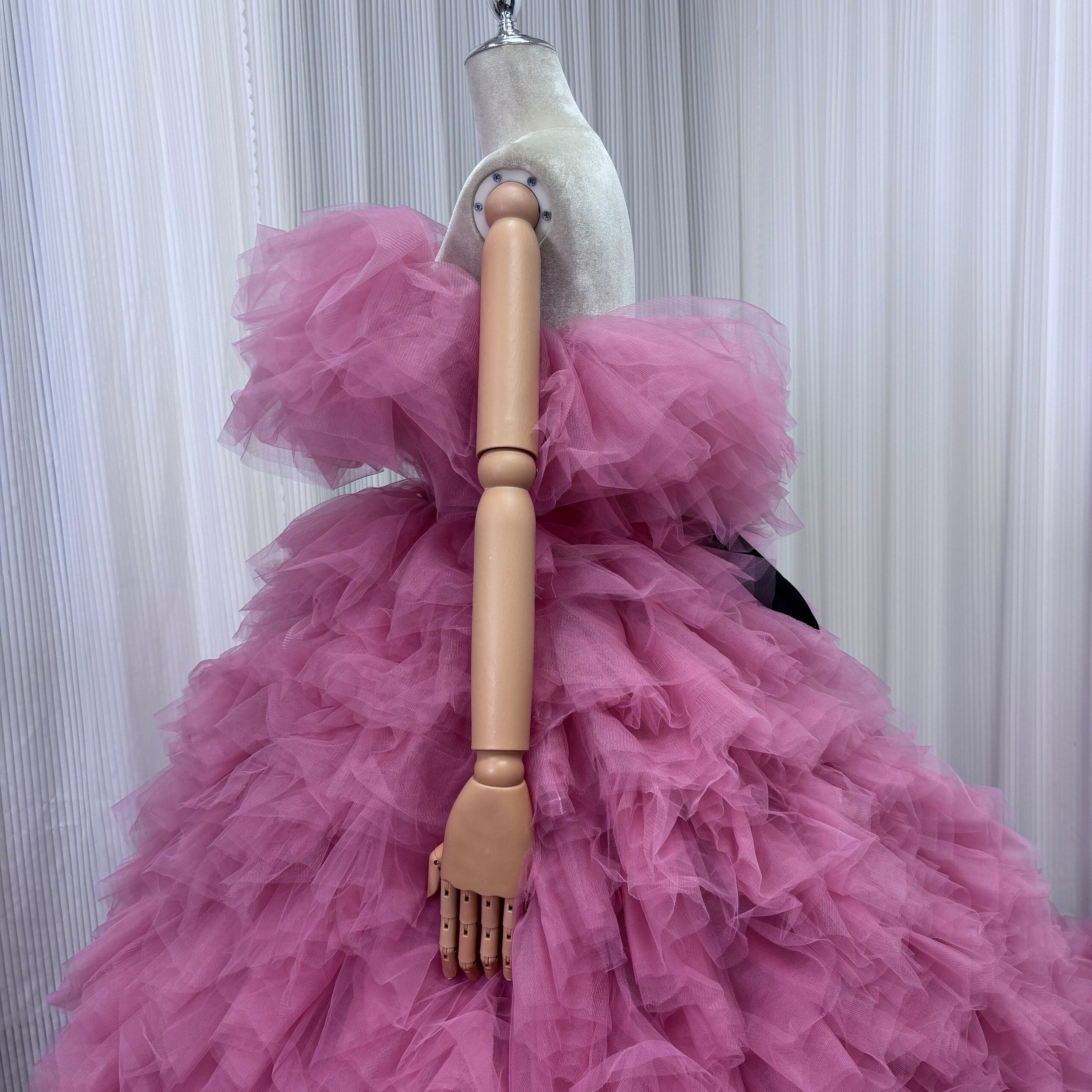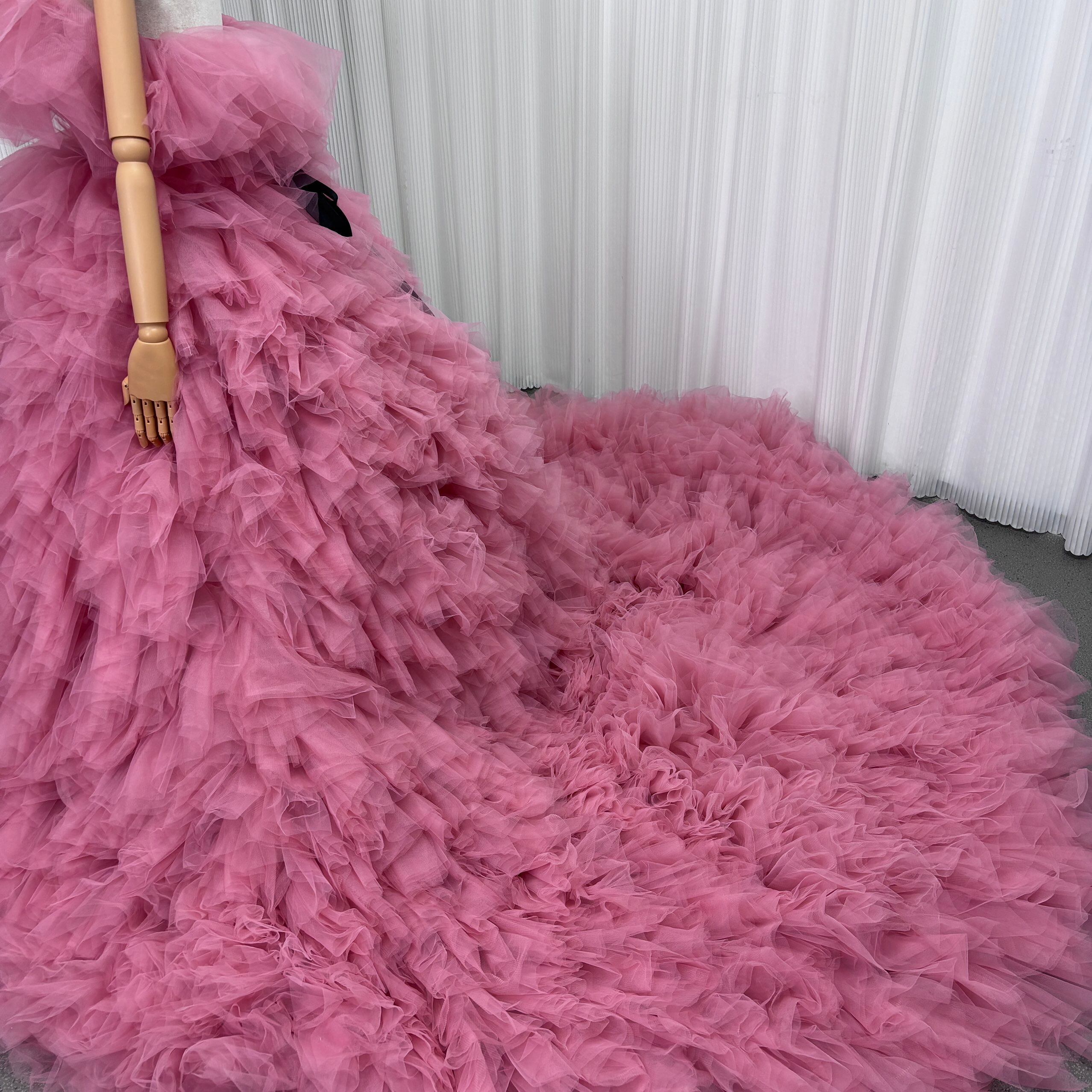 カラードレス ピンク オフショルダー サッシュベルト ふわふわドレス 華やかなトレーン 花嫁 前撮り