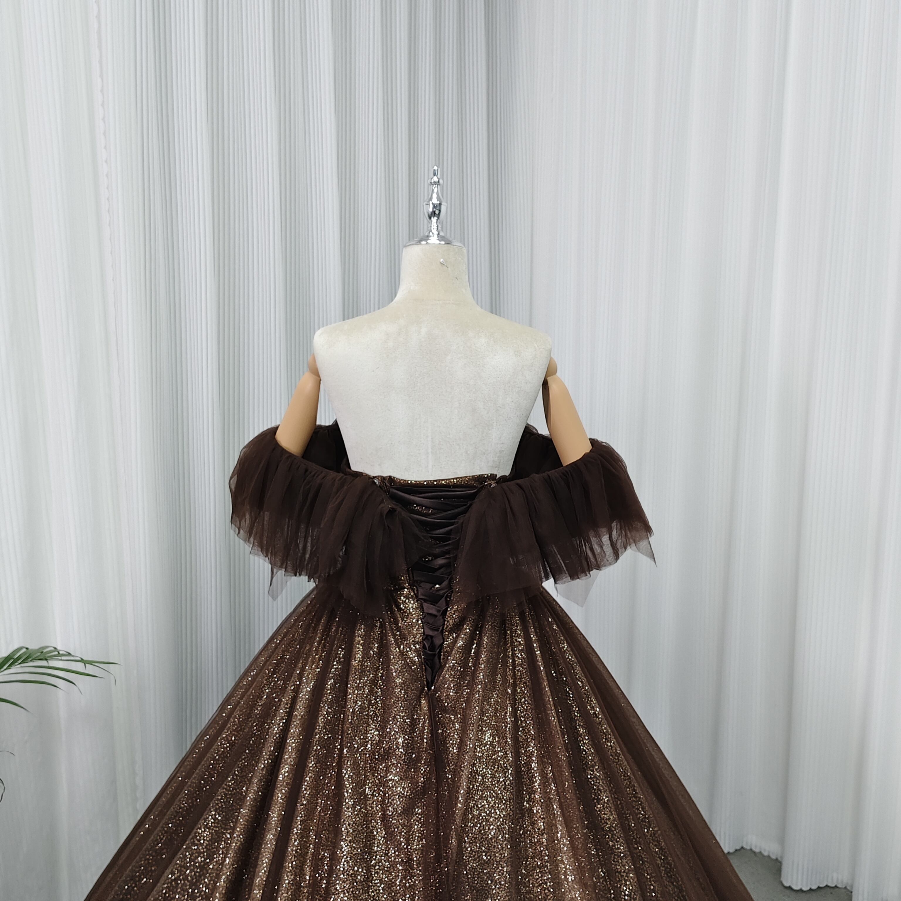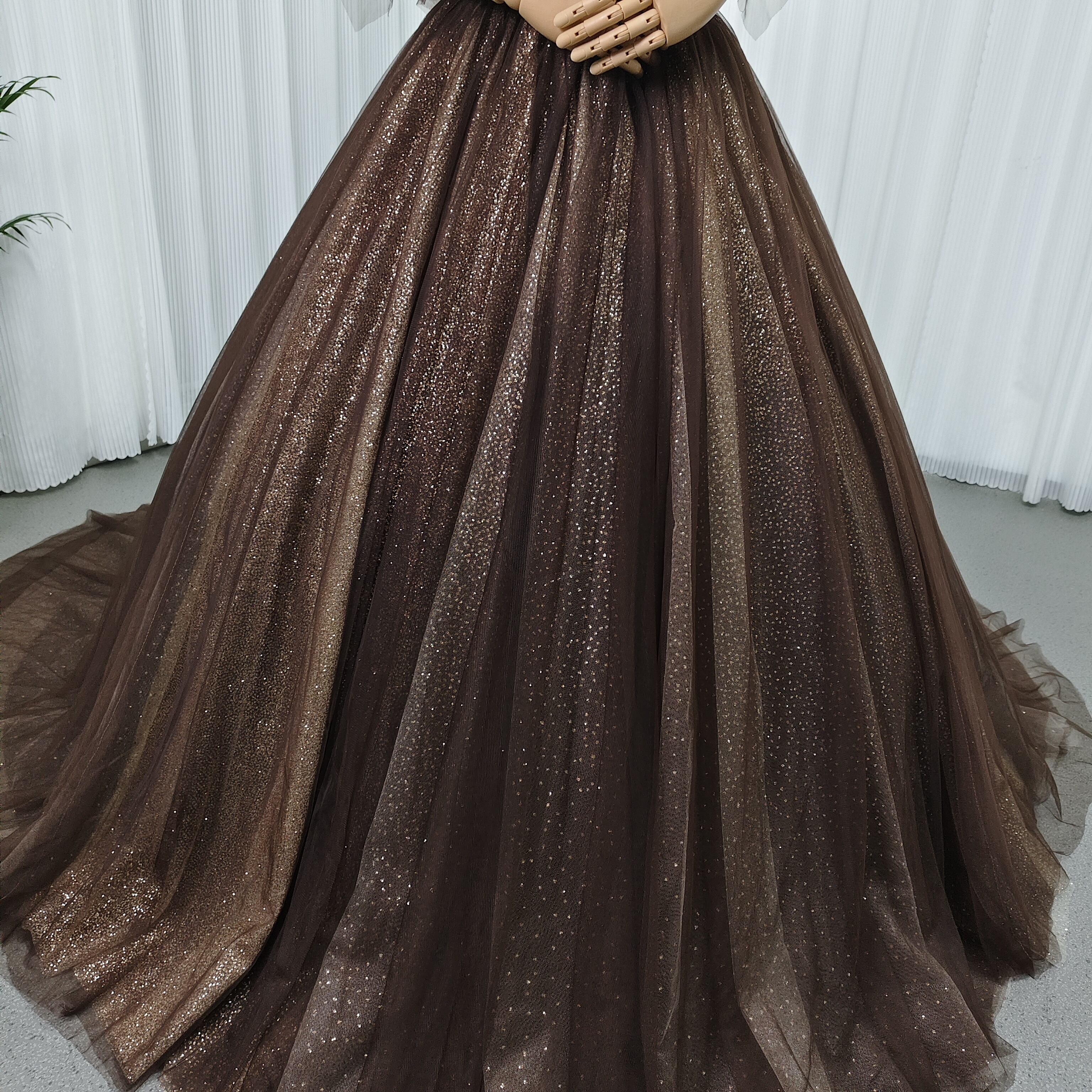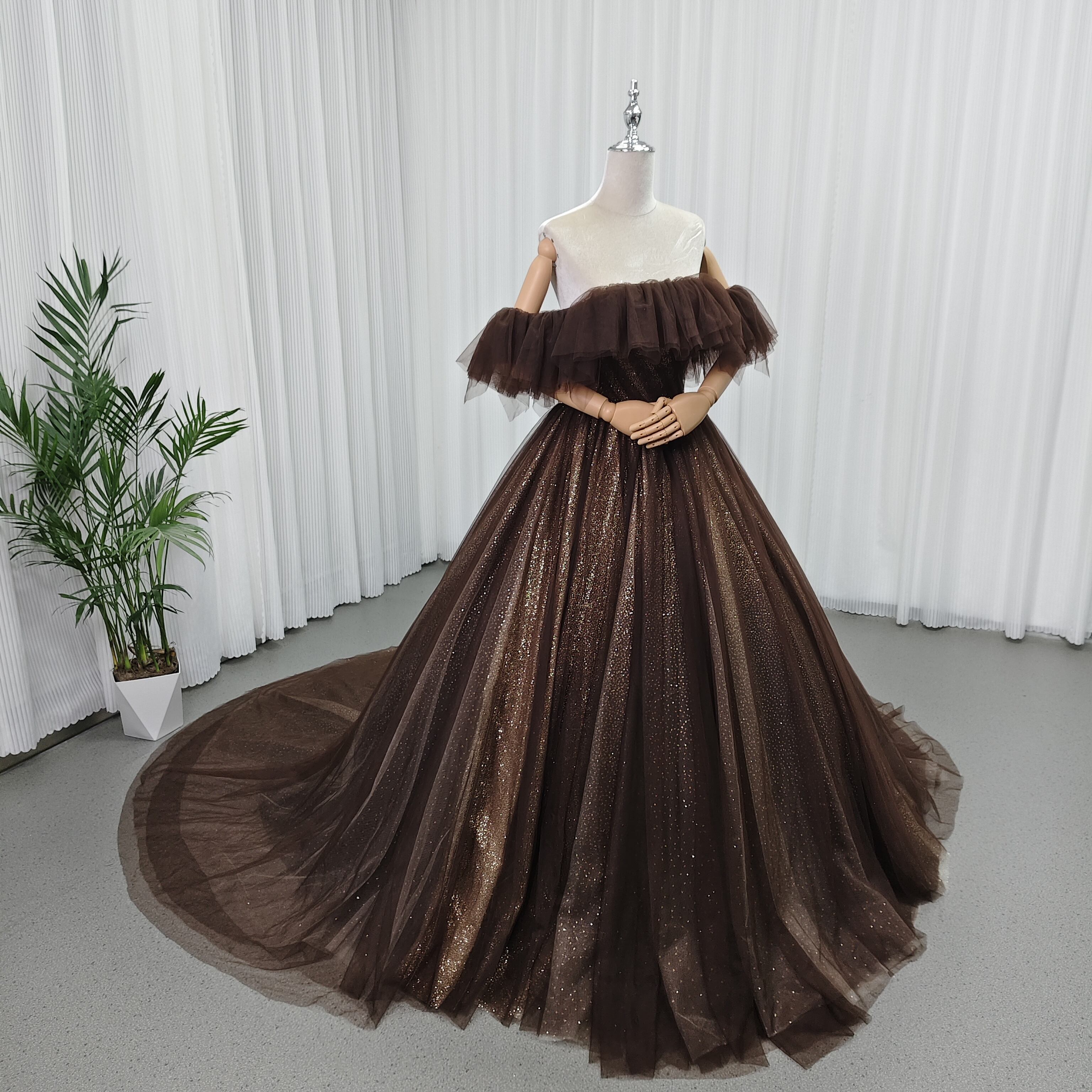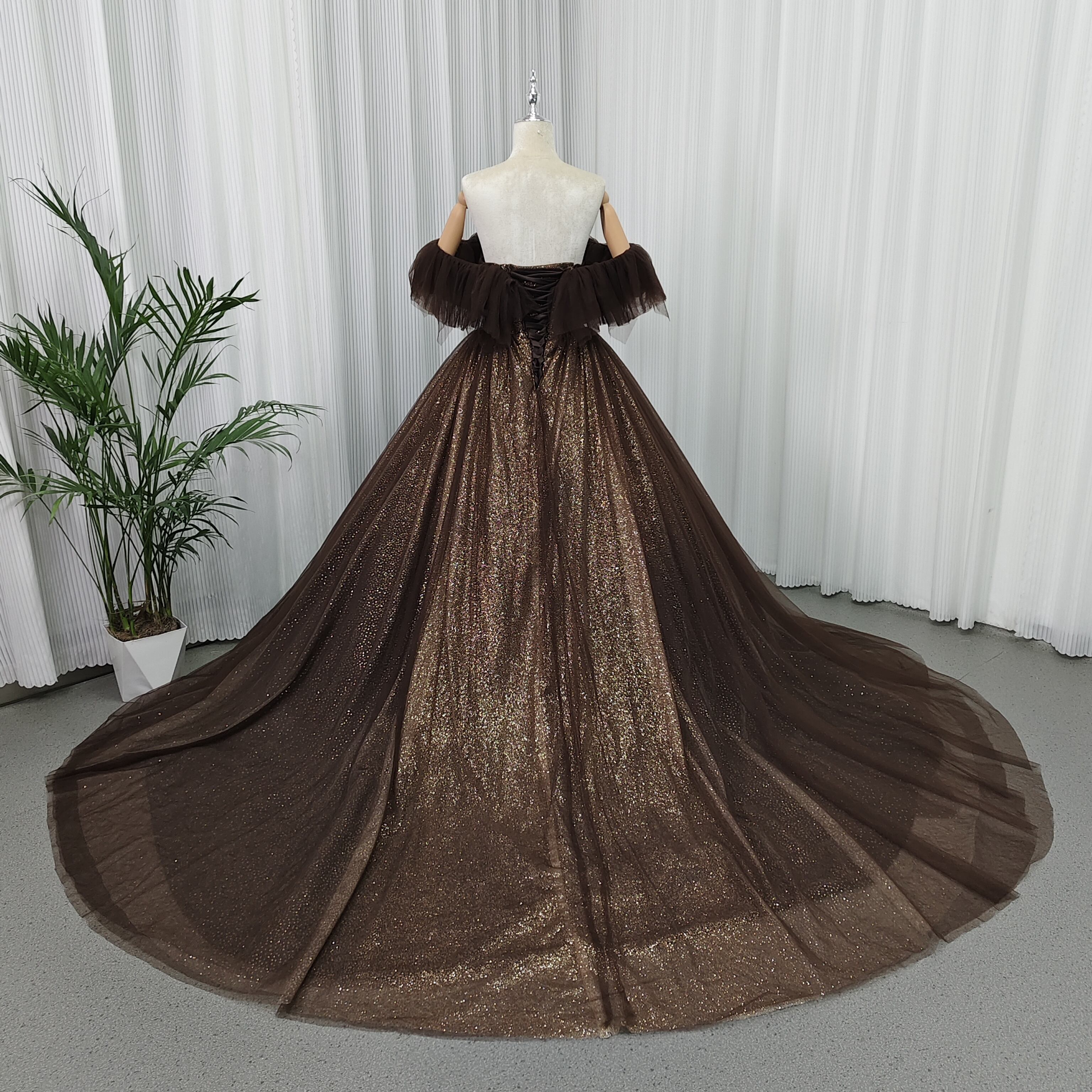 カラードレス ブラウン グラデーションドレス シークインチュール オフショルダー 華やかなトレーン 花嫁
