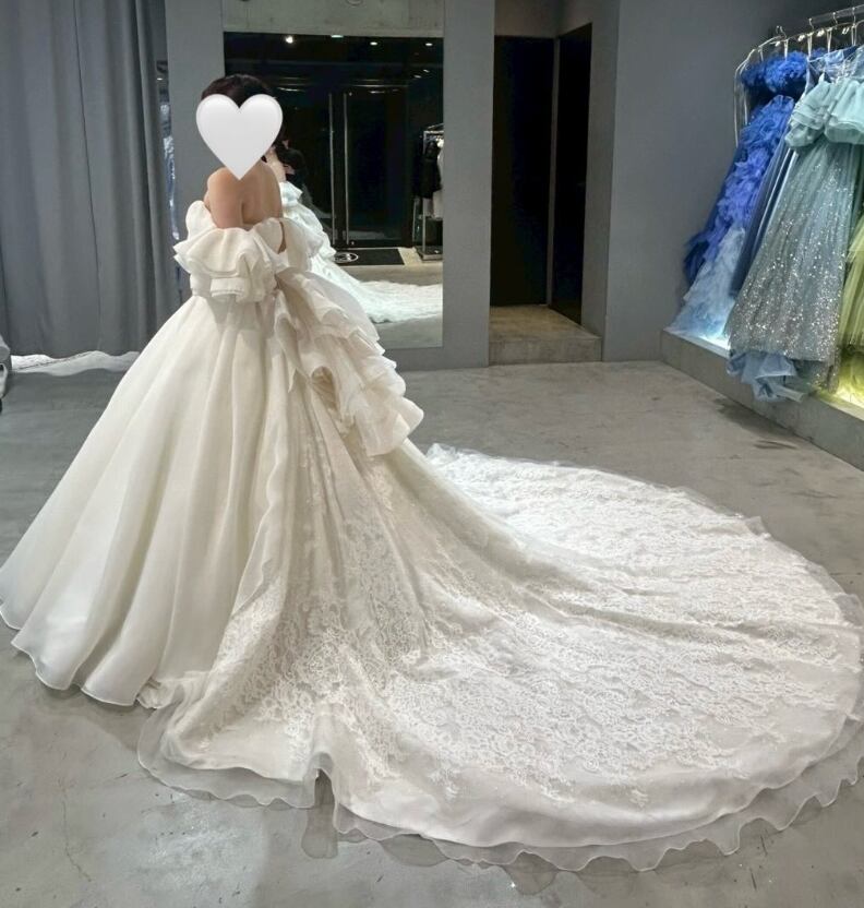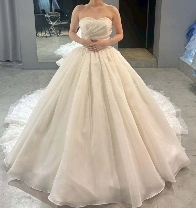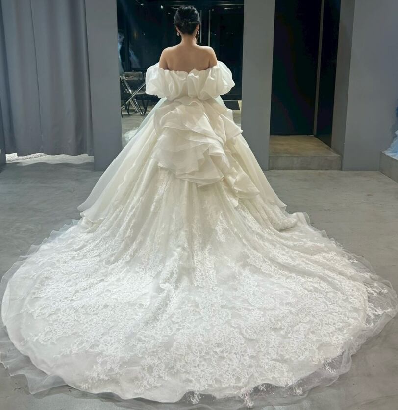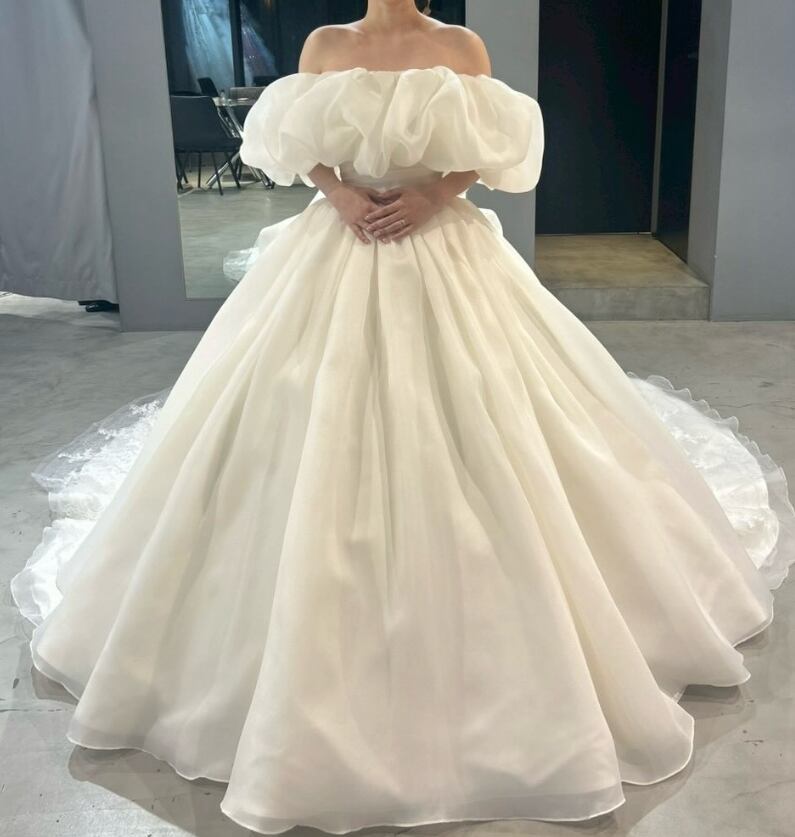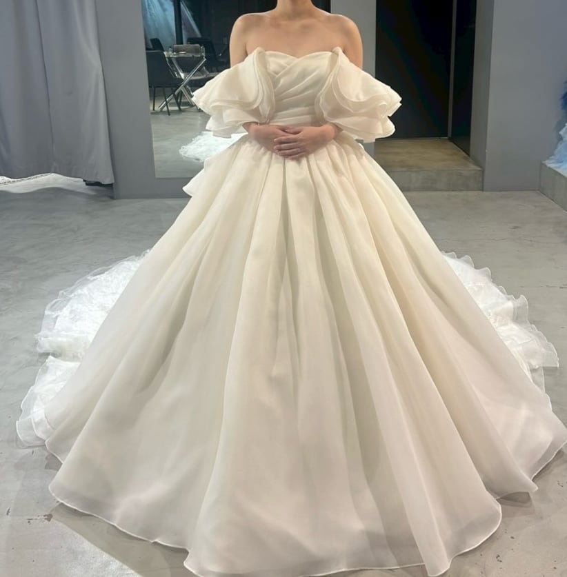 ウエディングドレス オフホワイト 取り外し可能なオフショルダー 3WAYの着方 ボリュームドレス 華やかなトレーン ブライダル