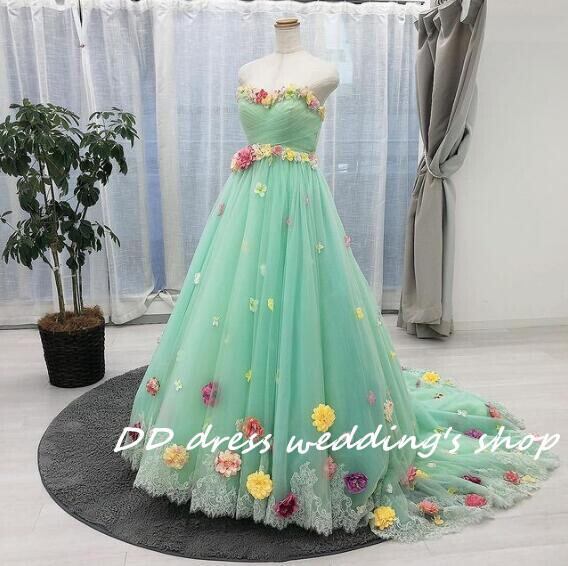 緑 ベアトップ カラードレス ソフトチュール 花モチーフ エレガント 披露宴/挙式
