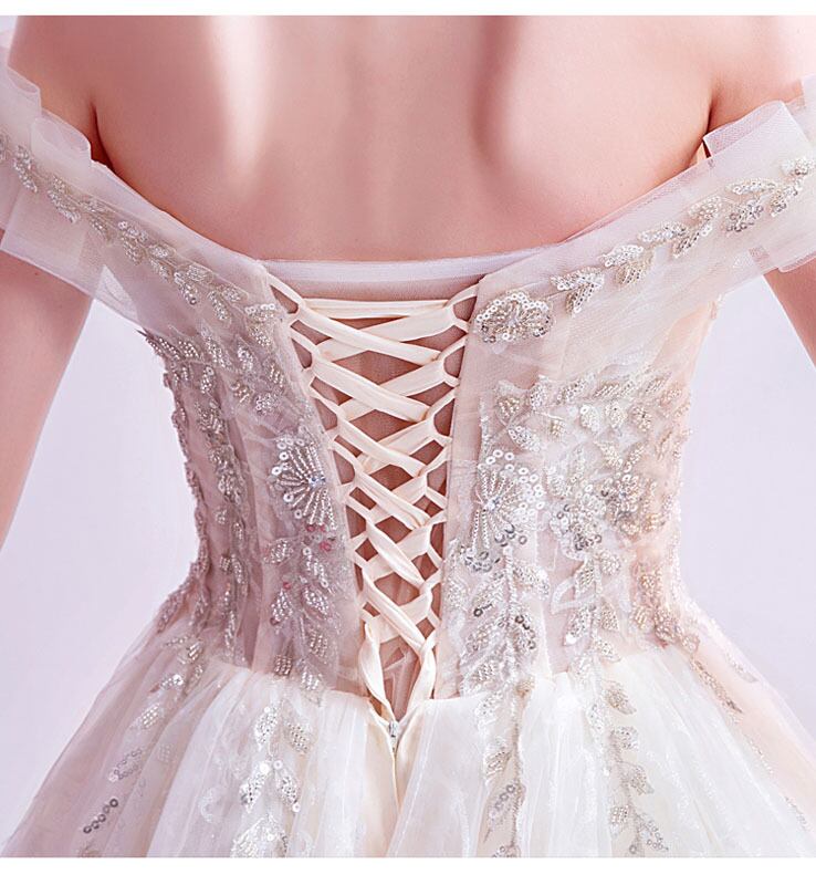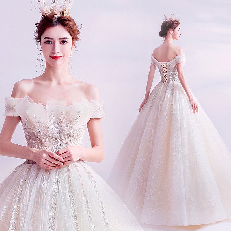 ウエディングドレス 二次会 wedding dress 上品 ブライダル パーティードレス オフショルダー プリンセス ロングドレス キラキラ お嬢様 刺繍