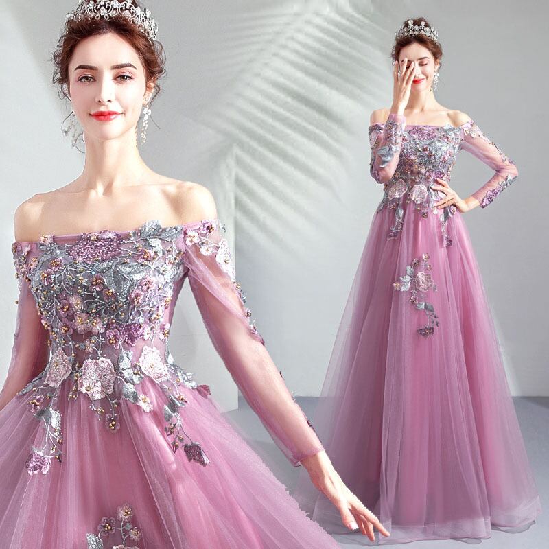 カラードレス 長袖 パープル パーティードレス 花嫁 結婚式 ウェディングドレス 二次会