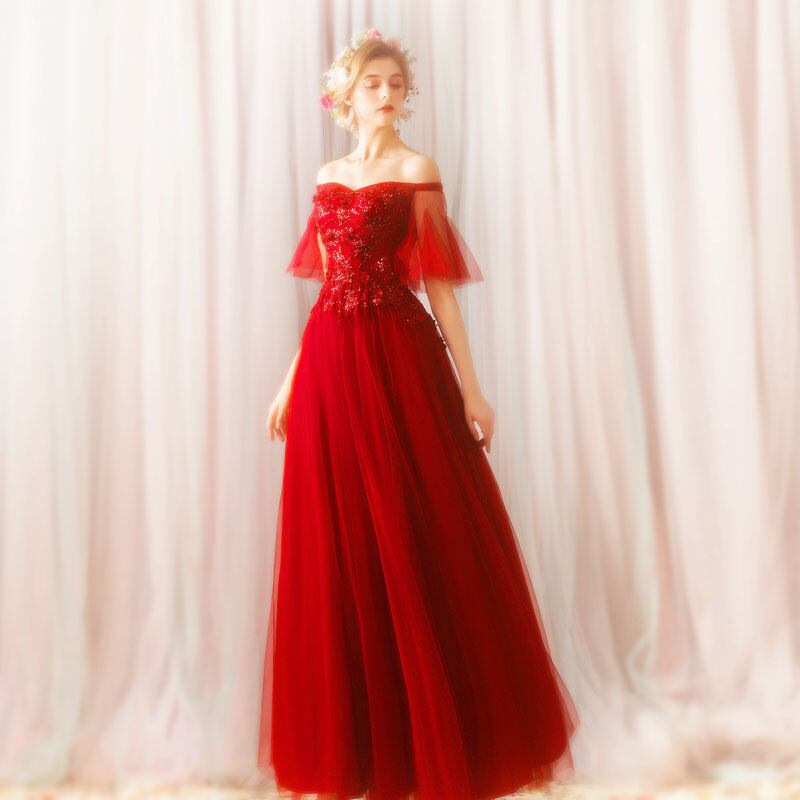 ロングドレス 半袖 演奏会 カラードレス 赤 花嫁 カクテルドレス 結婚式