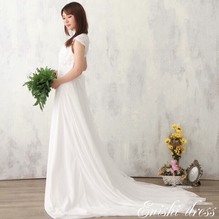ウェディングドレス シフォンドレス エンパイアライン 二次会 花嫁 ドレス バックリボン レーストップス 前撮り 後撮り